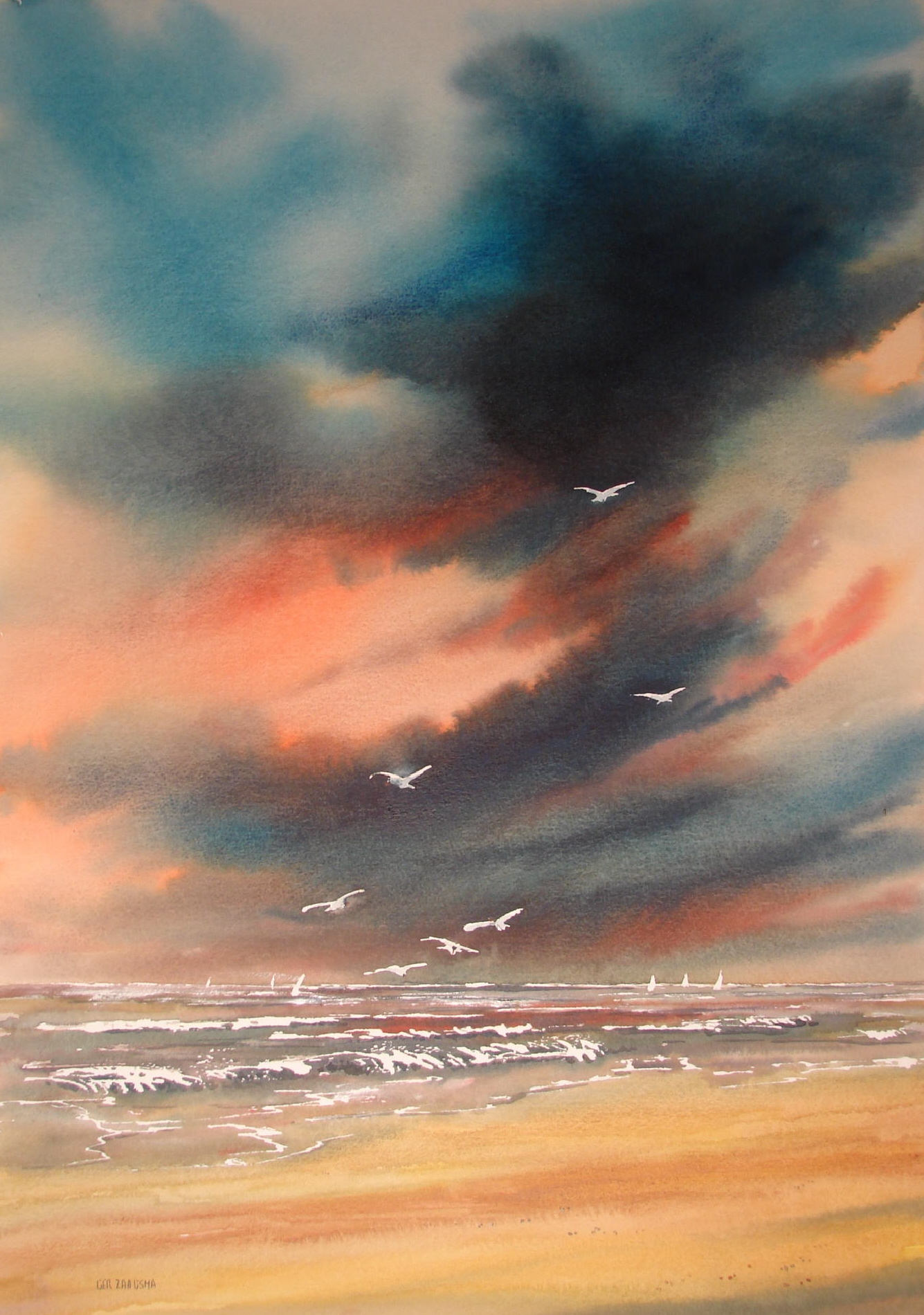 Realistische aquarellen en olieverf schilderijen van Hollands landschap, met altijd expressieve luchten boven de lage horizon zich spiegelend in de waterrijke polder. Ook werken uit de Franse Morvan en van de Oostelijke Algarve in Portugal.