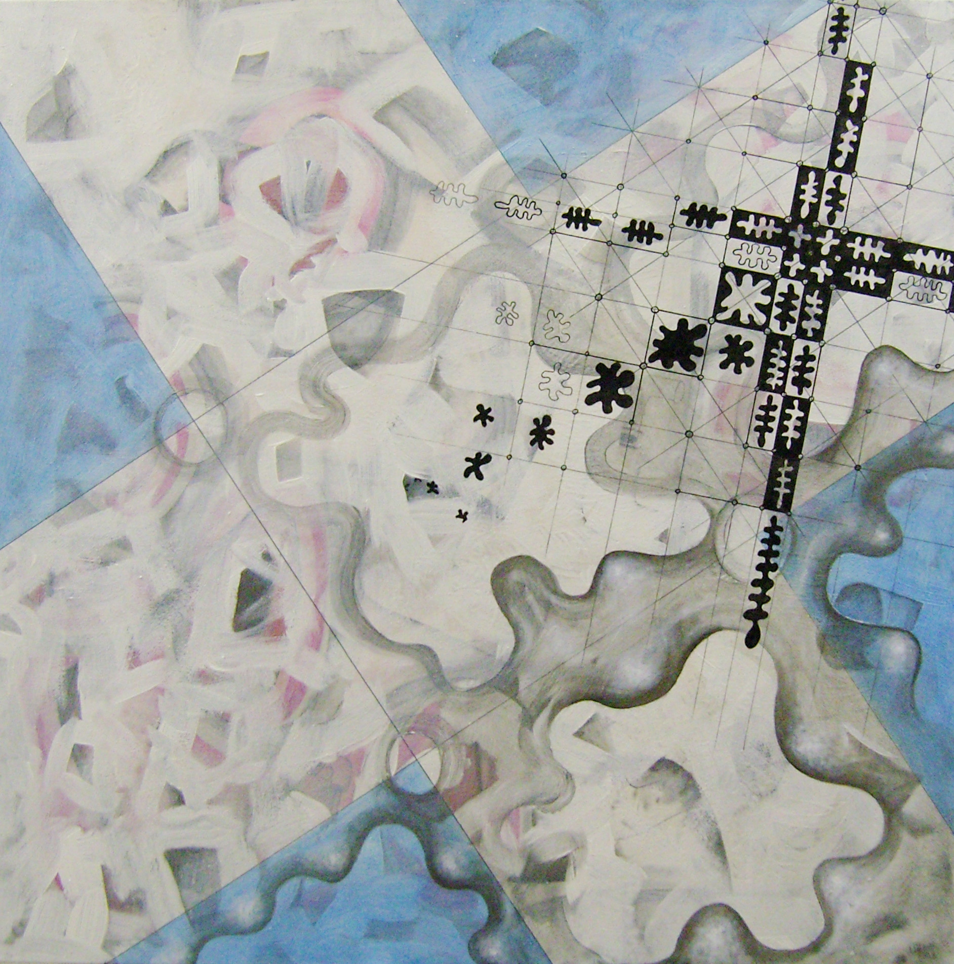 Thema: Chaos (Geometrische Chaos) Mijn kunst is beïnvloedt door de moderne wiskundige en wetenschappelijke benadering van het begrip complexe orde van de natuur. Met name heb ik me verdiept in de Chaos theorie en de fractal geometrie. Ik ben geen wiskundige, en ik gebruik geen wiskundige formules. De ideeën van de Chaos theorie en fractal geometrie leiden tot de ontwikkeling van de composities in mijn werk. Ik gebruik driehoeken,vierkanten en cirkels in mijn schilderijen, maar in mijn huidige serie, geoChao richt ik me alleen op de vierkanten en de verhoudingen tussen de vierkanten. Ik ontwikkel mijn composities door kleine vierkantjes op grote te zetten of grote op kleine te zetten. Het gaat om de onderlinge verhoudingen tussen de vierkanten. Ik laat de methode die ik kies de compositi
