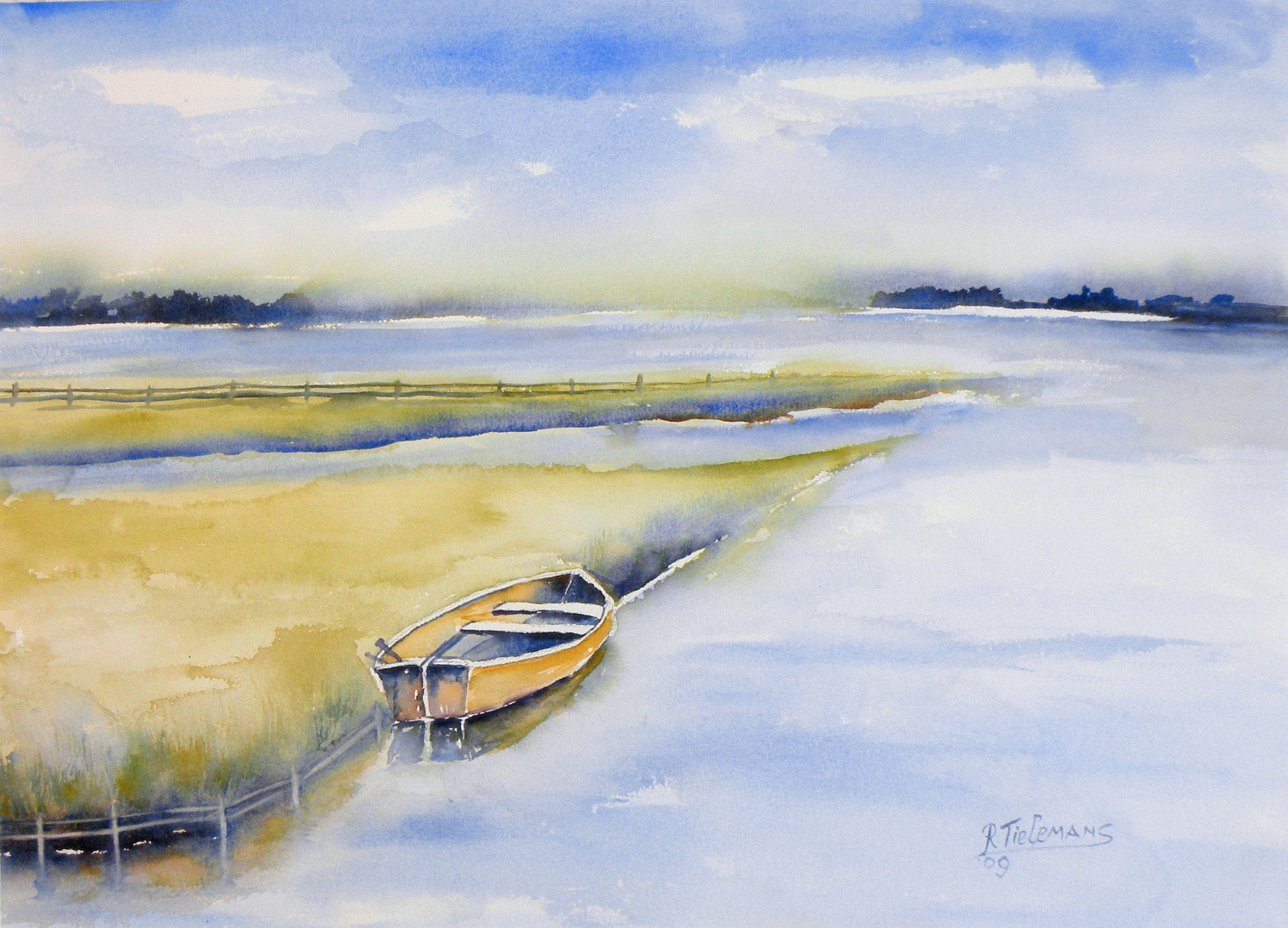Sloep, aquarel van landschap