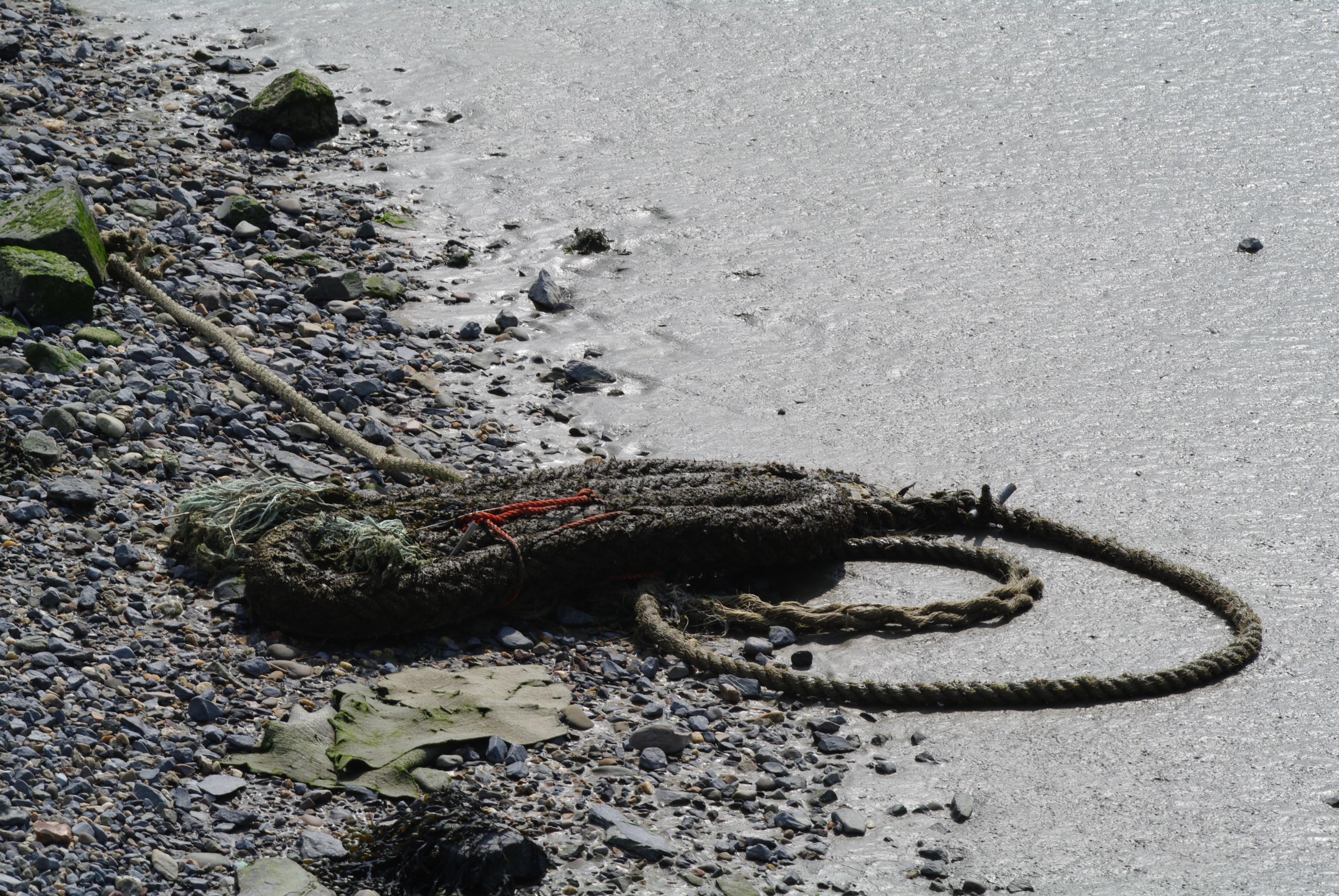 Een stuk tros van een schip uit de rivier in de omgeving in de natuur tussen water en droog gelegd..