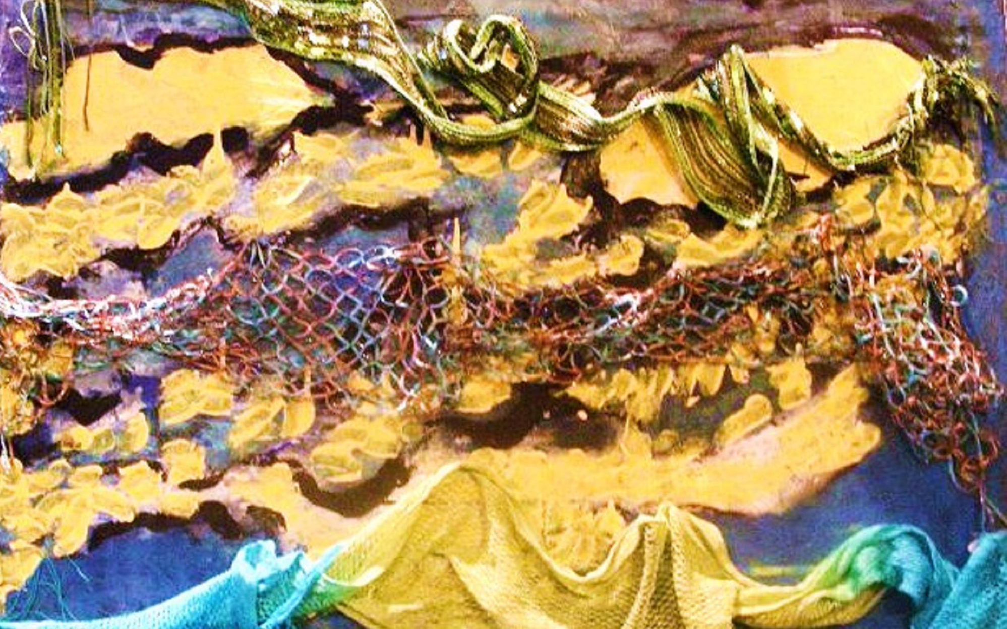 KRETA het is een paneel waarop eerst met acryl is geschilderd en daarna door middel van doeken van zijde en ander textiel tot een kleurrijke en spannende kompositie is gevormd.