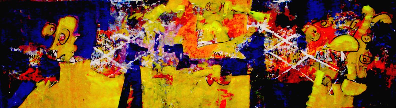 abstract met figuratieve elementen, groot doek geschilderd op stevig polyester zeil, is opgerold, om op te slaan of te vervoeren. Het dient te worden opgespannen, dat werkt met keilbouten in de muur aan de vier hoeken en dan vast trekken of met bijgelverde stokken aan de zijkant om het vast te bevestigen en strak te trekken,