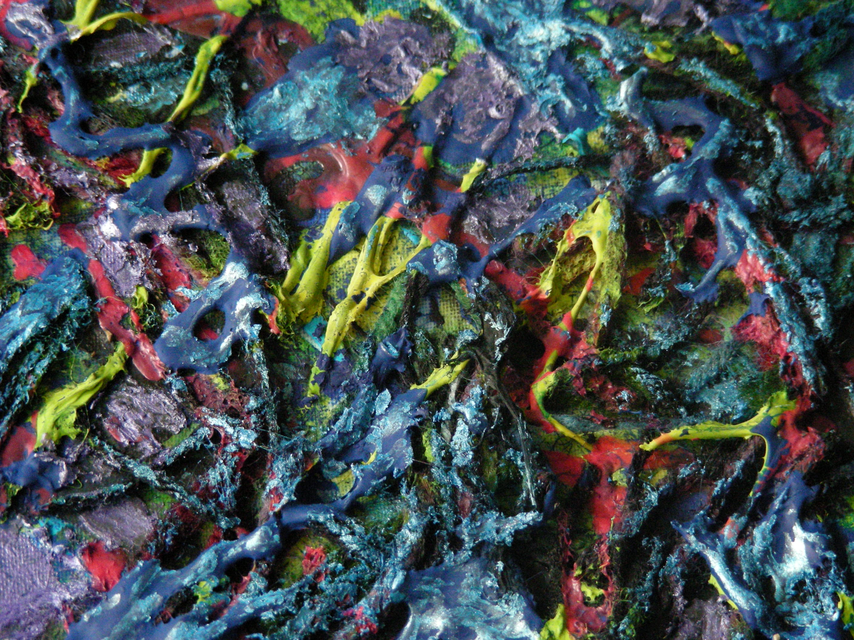 GEK MANNETJE acrylverf op klein doekje gedecoreerd met wollen draadjes geverfd met verschillende kleuren