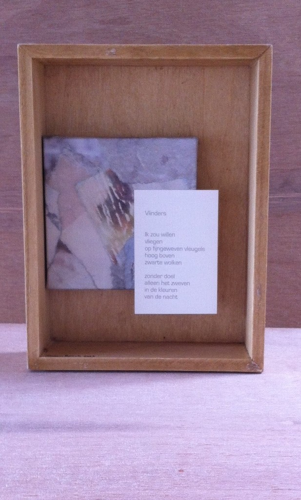 klein houten doosje met daarin een miniatuur collage op canvas en gedicht