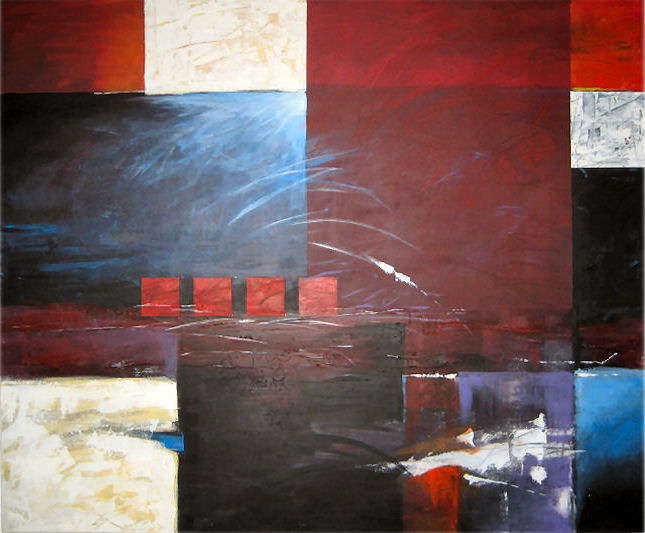 modern schilderij, vrij donker met rode accenten. Ik hou van tegenstelling;bv. zwart met fel rood