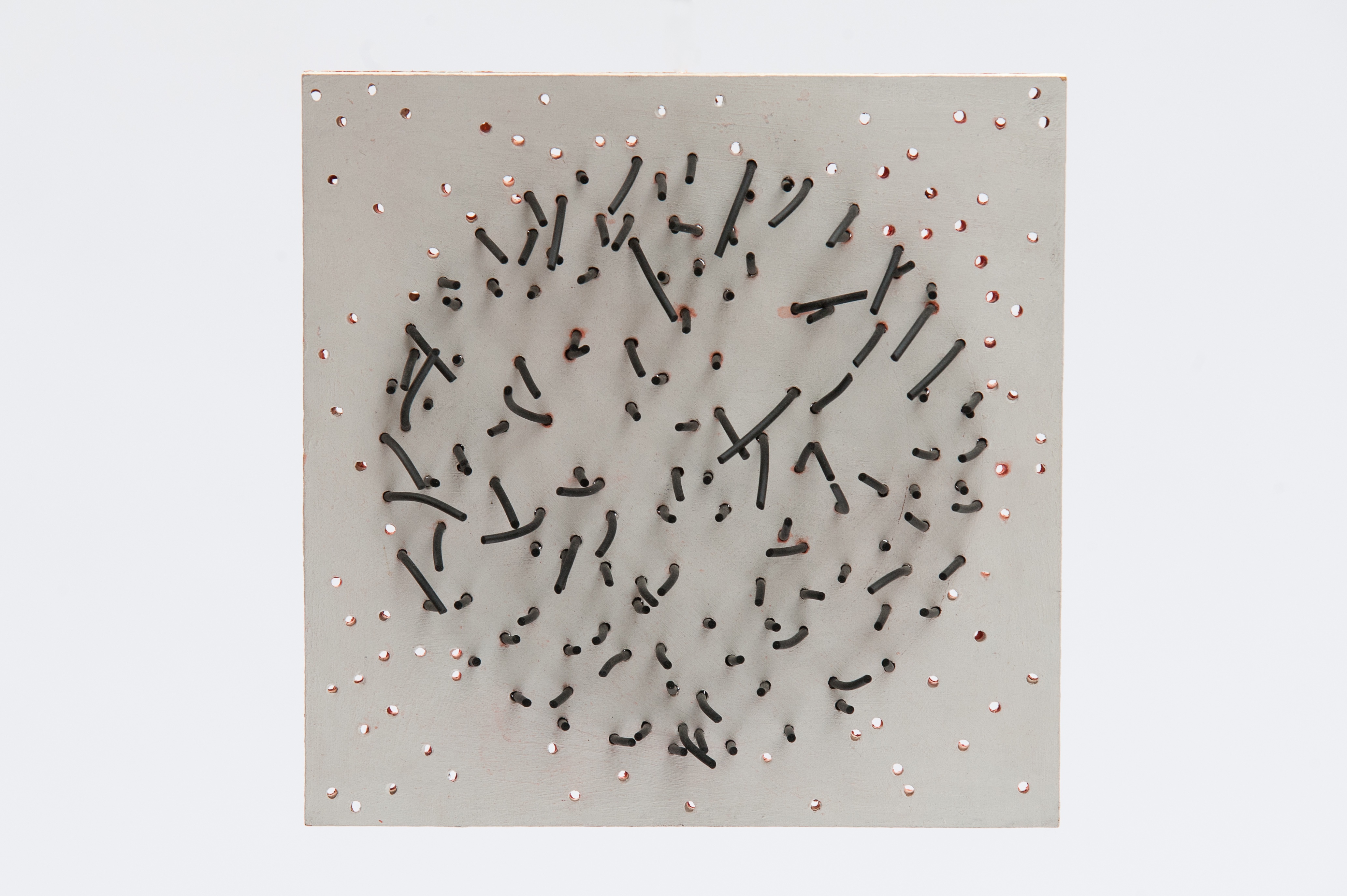 Door mijn ogen gezien, is de tastbare wereld opgebouwd uit puntjes. Vele bewegende puntjes, in verschillende dichtheid, veroorzaken vorm, maar veel minder vast dan je tastend zou voelen. In mijn werk communiceer ik deze waarneming.