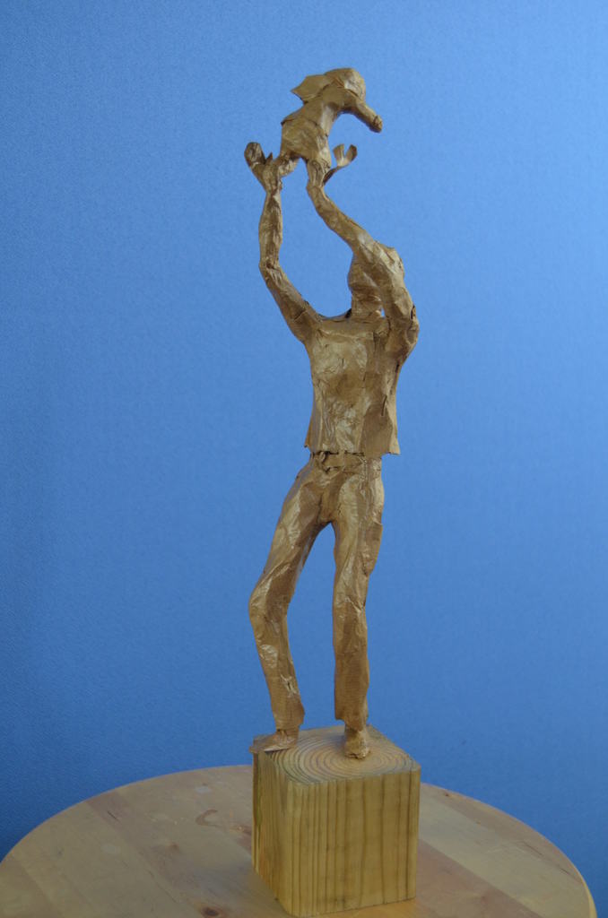 Vader vangt zijn zoon. Je hoort het kind schateren. Unica, Uniek proecede, van papier lagen, behandeld met diverse soorten lijm en acryl