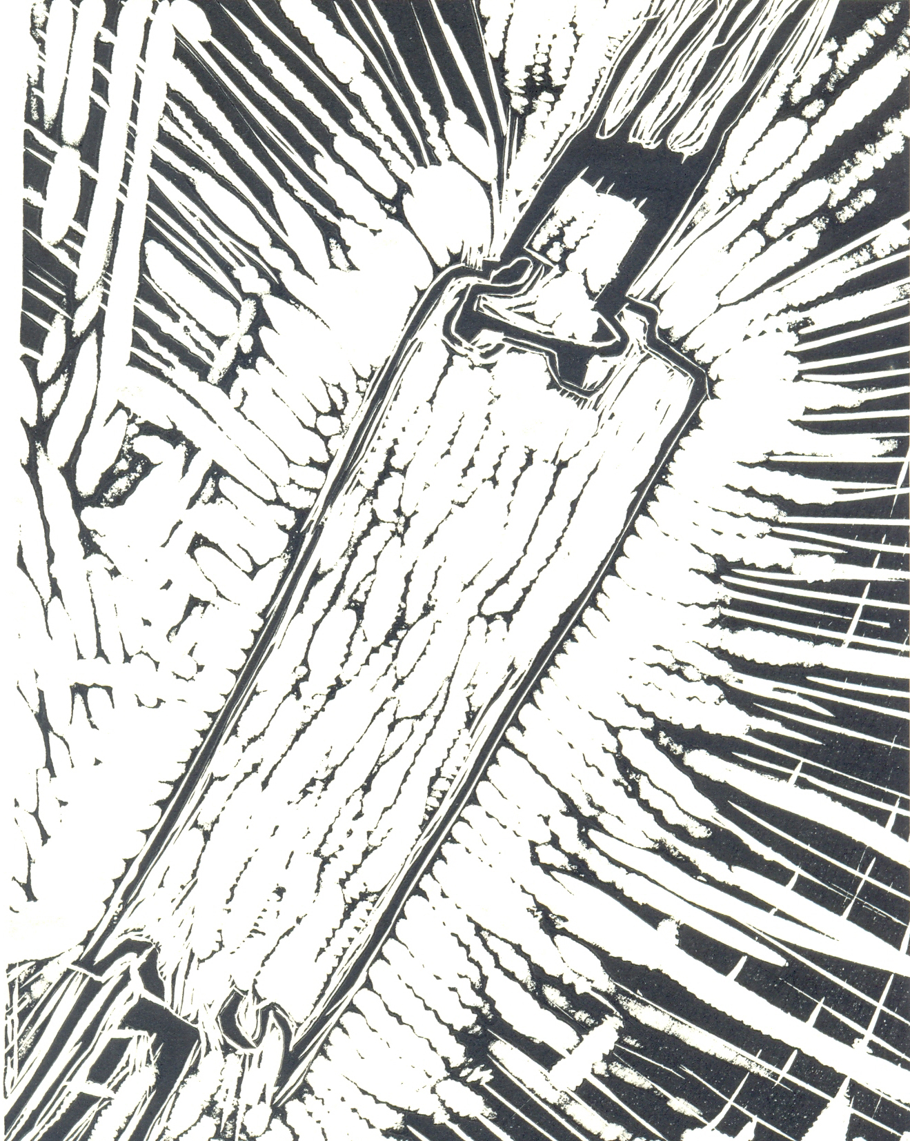 Een lino van Joosts hand. Een abstracte vertaling van een tl-lamp.
