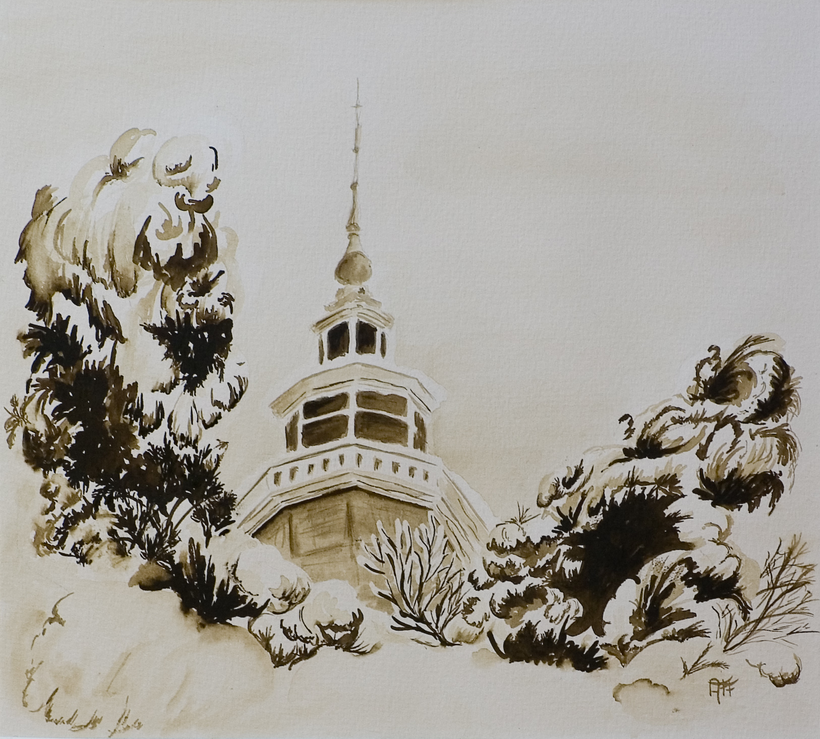 Het stadhuis van Bolsward in de sneeuw. Geschilderd in één kleur.