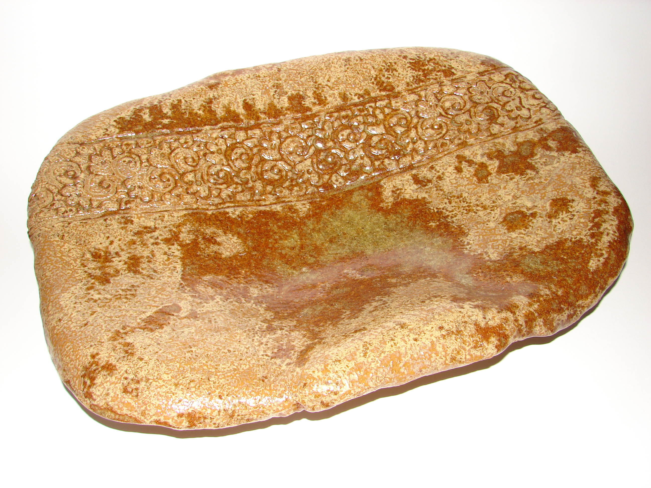 Grote terracotta schaal met ingerolde decoraties, staat op voet. Gesigneerd.