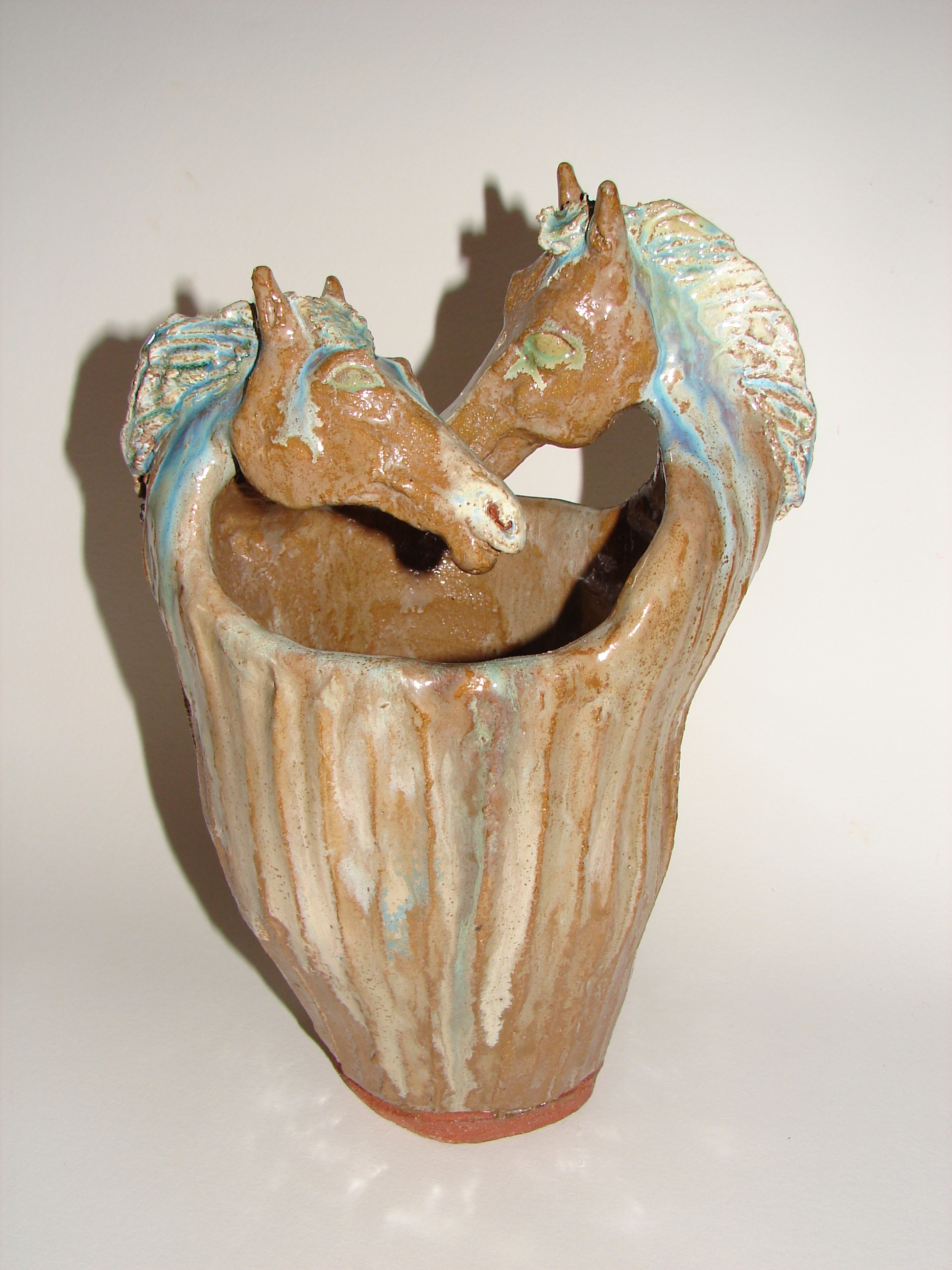 Deze vaas met twee naar elkaar toegenegen paardenhoofden is handgebouwd van grove terracotta klei en geglazuurd met goud-bruin en blauw kristalglazuur.