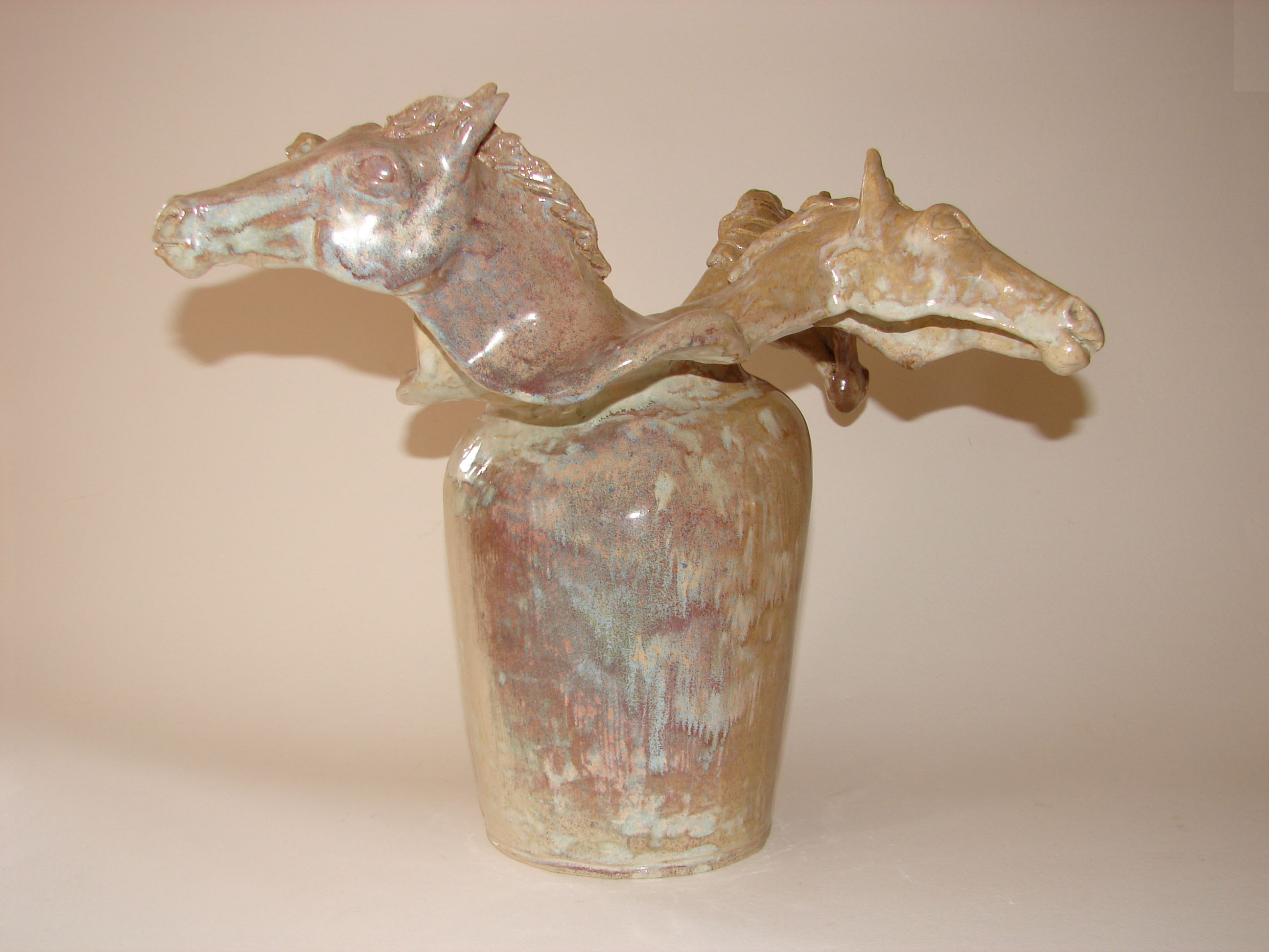 Dit is een handgebouwde vaas van witte fijne chamotte met vier paardenhoofden. De hoofden zijn hol gebouwd. De vaas is afgewerkt met witte en paarse kristalglazuur.