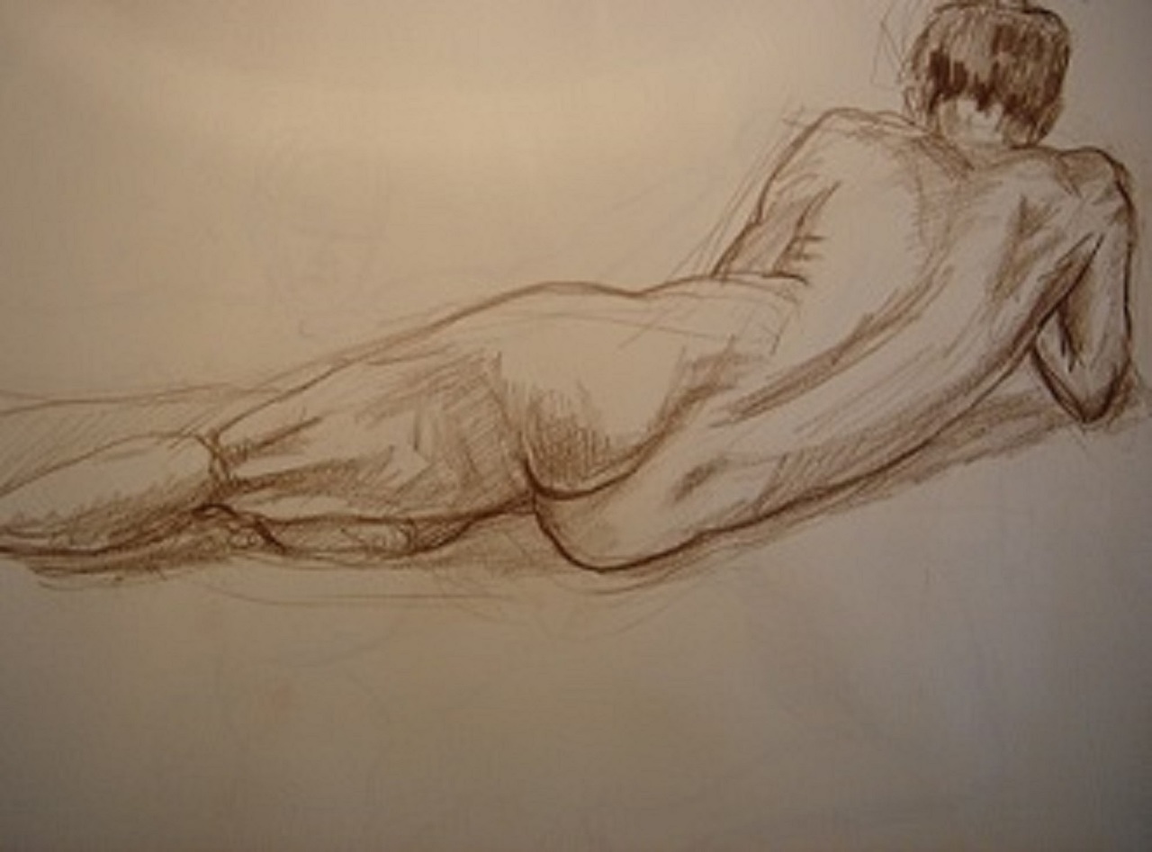 Schets in potlood, rug naakte man, naar levend model, op papier ca. 30x40 cm.