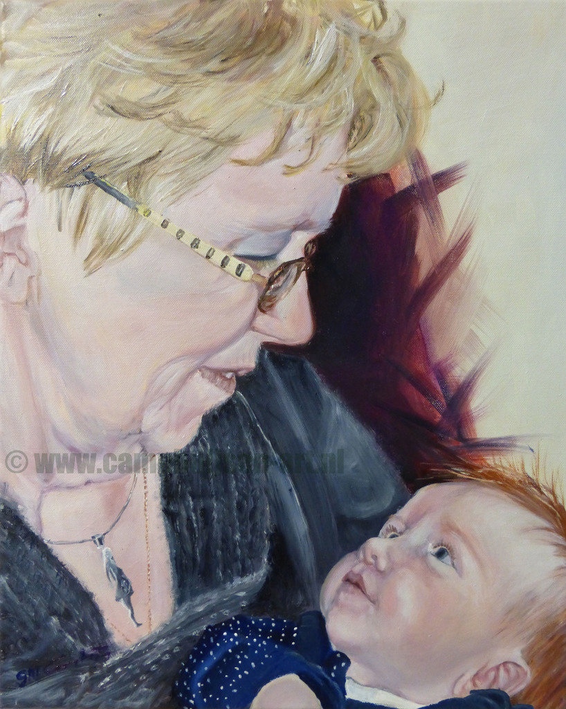 Een portret van mijn zuster, die als kraamzuster in haar werk vele baby's in haar armen hield en ook bij haar neefjes en nichtjes, maar nu de trotse moeder is van haar eigen eerste kleindochter.