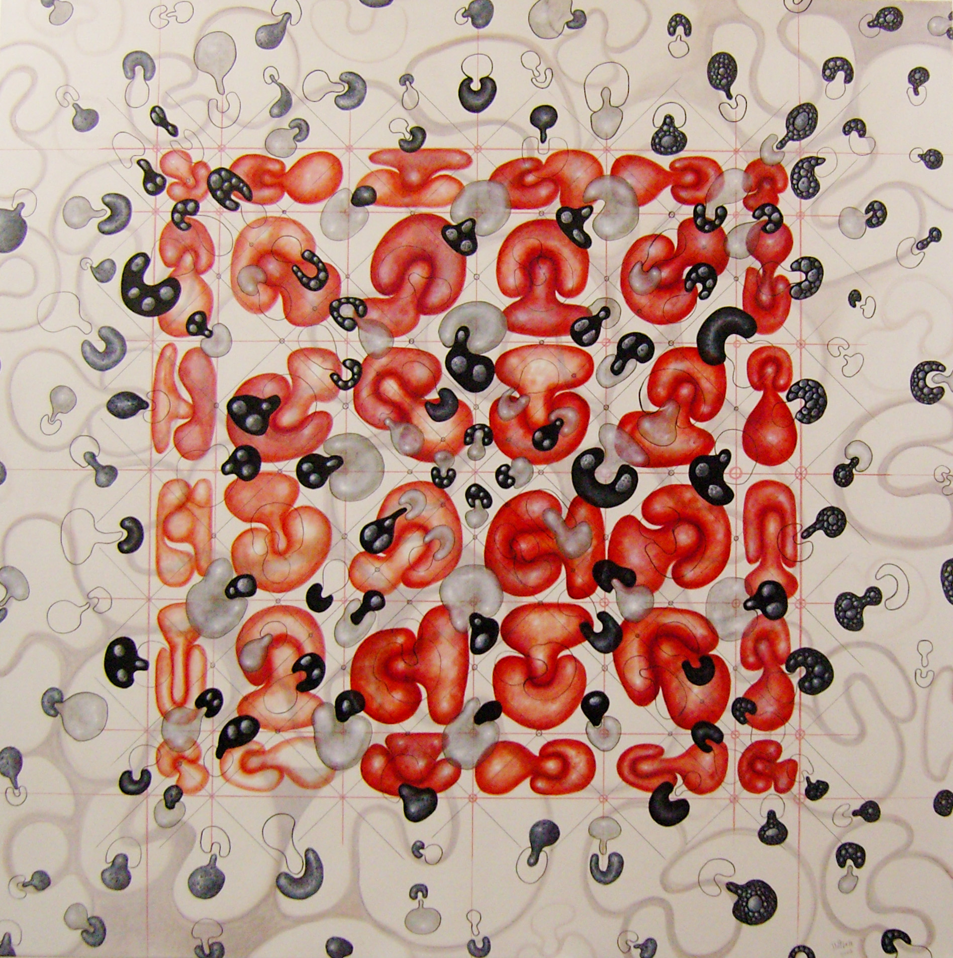 Thema: Chaos (Geometrische Chaos) Mijn kunst is beïnvloedt door de moderne wiskundige en wetenschappelijke benadering van het begrip complexe orde van de natuur. Met name heb ik me verdiept in de Chaos theorie en de fractal geometrie. Ik ben geen wiskundige, en ik gebruik geen wiskundige formules. De ideeën van de Chaos theorie en fractal geometrie leiden tot de ontwikkeling van de composities in mijn werk. Ik gebruik driehoeken,vierkanten en cirkels in mijn schilderijen, maar in mijn huidige serie, geoChao richt ik me alleen op de vierkanten en de verhoudingen tussen de vierkanten. Ik ontwikkel mijn composities door kleine vierkantjes op grote te zetten of grote op kleine te zetten. Het gaat om de onderlinge verhoudingen tussen de vierkanten. Ik laat de methode die ik kies de compositi