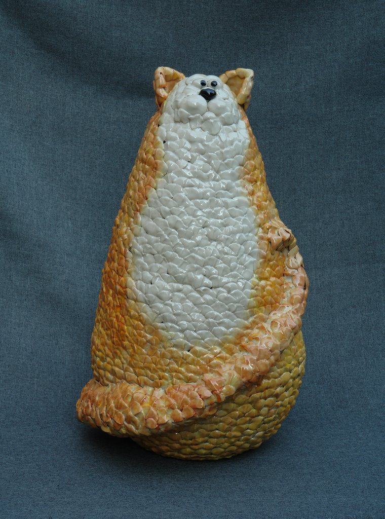 Grote oranje-rode kat, opgebouwd uit kleine plakjes klei (zonder inwendig geraamte gecreëerd).