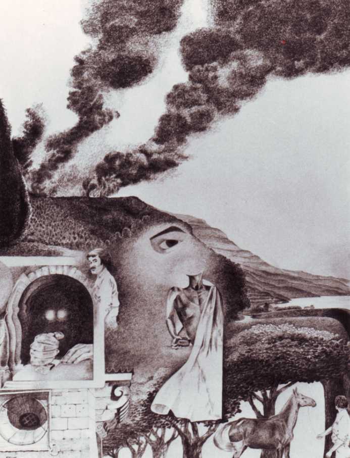 Surreeel Grijs Landschap Papier Potlood Lichaam Paard Rook