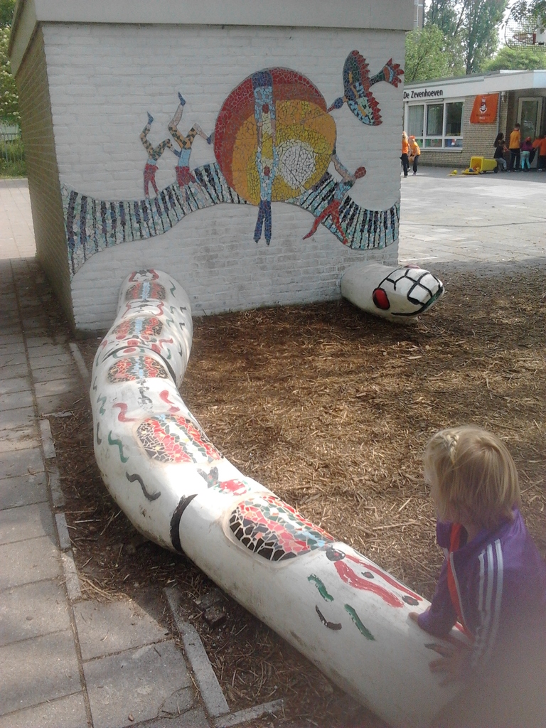 Op basisschool de Zevenhoeven hebben we een samenwerkingsproject afgerond. Van een heel saaie muur hebben Cees-Jan Aardenburg en Marielle van de Wal en theatertje gemaakt. Het surrealistische mozaïek heeft groep 6 geplakt. De Slang heeft Cees-Jan vervaardig. Met dank aan Hovenier Martin twaalfhoven voor het hout en Edi de Bie voor de logistiek.. Een verrijking van het schoolplein, de kinderen zijn er blij mee!