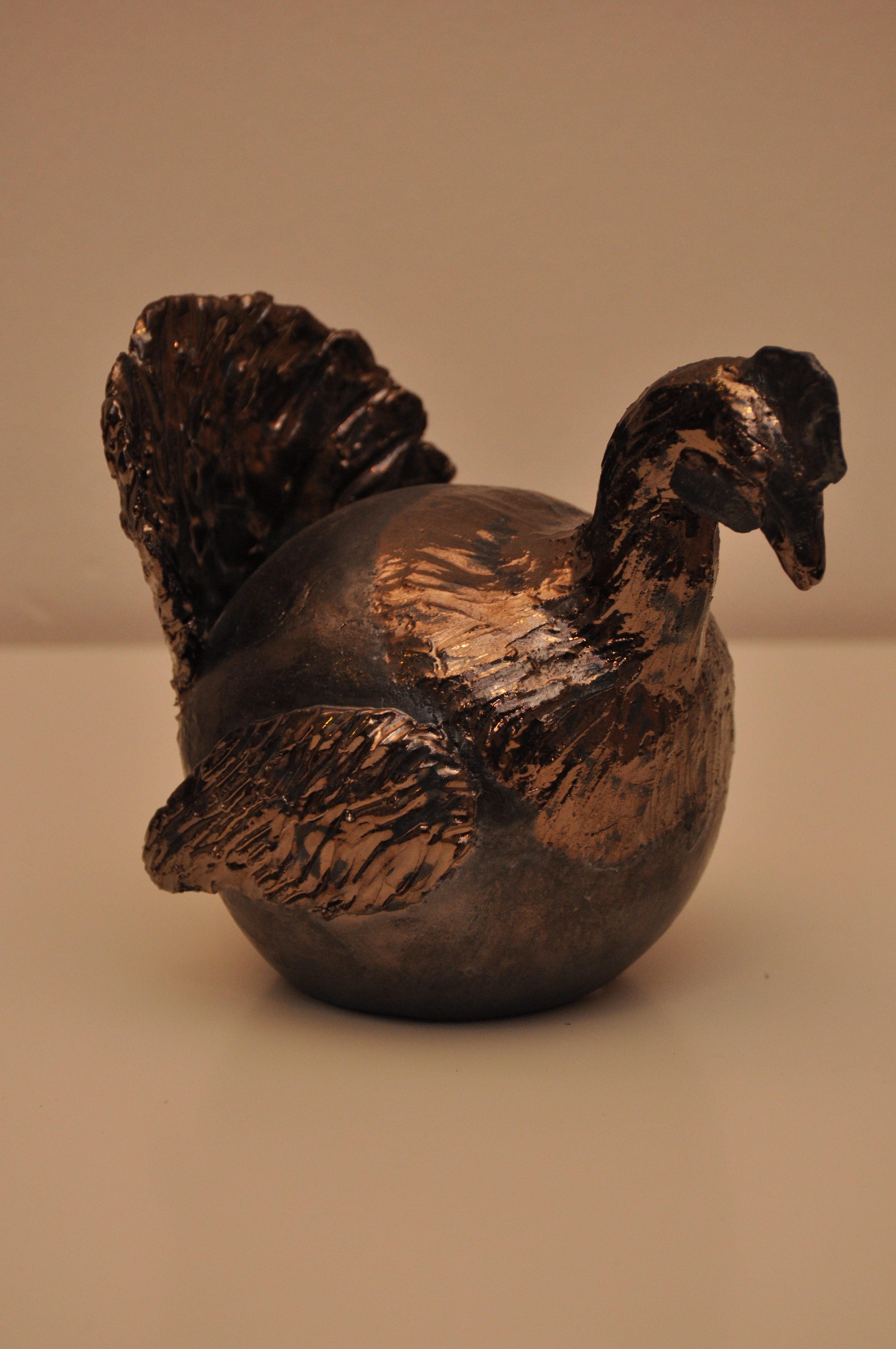 gouden kip van zwartbakkende klei afgewerkt met goud- en zilver glazuur