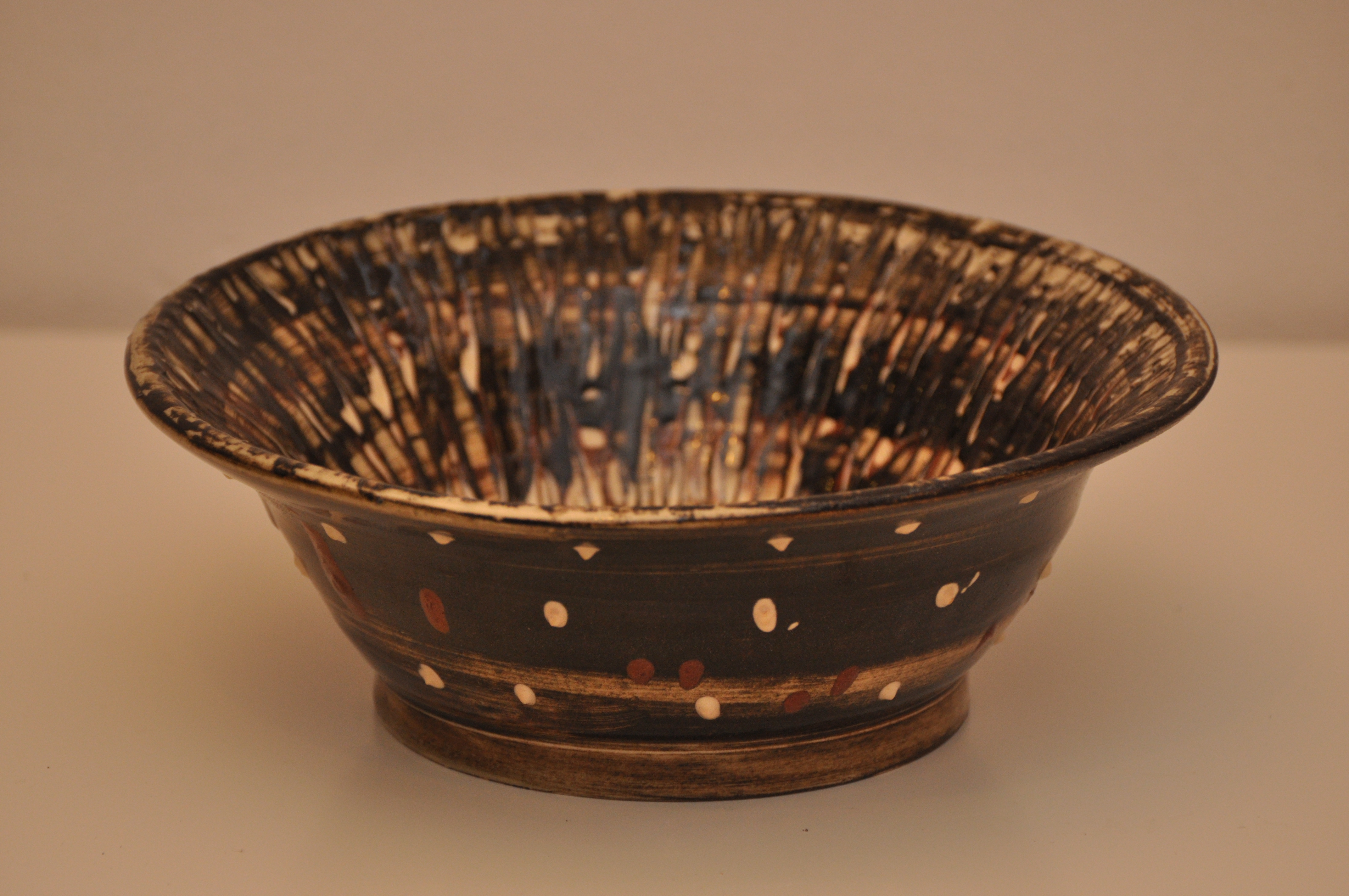 veertrek decoratie handgedraaide schaal uit witte klei en met wit zwarte en rode engobelaag overtrokken
