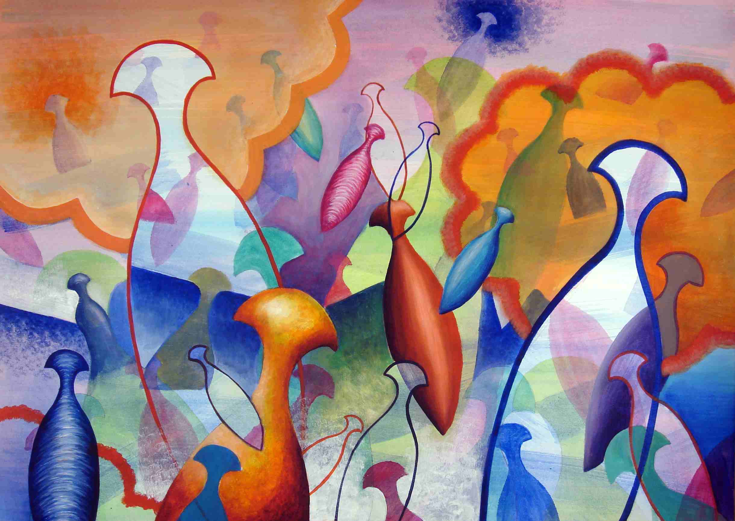 Mijn werk is zeer kleurrijk. Ik balanceer graag op de grens tussen figuratief en abstract, waarbij ik mijn eigen droomwereld creeer. Mijn inspiratie haal ik uit de natuur en het materiaal.