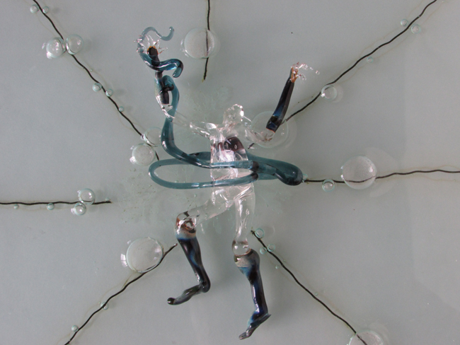Een figuurtje van glas is verwikkeld in een beweging, een draad van glas.Op de achtergrond is koper verwerkt in het glas. Het koper versterkt de beweging van de danser. De foto geeft alleen de danser weer, niet het totale paneel.