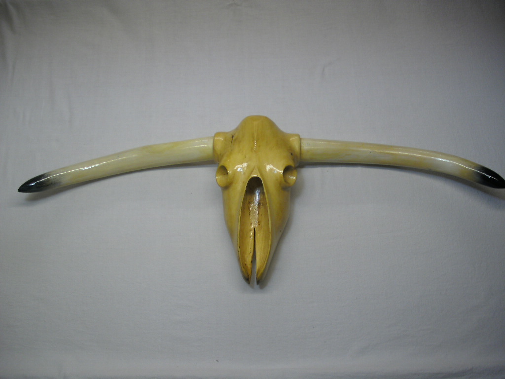 Uit notenhout vervaardigde schedel van een stier,deze is bewerkt met danisch oil.
