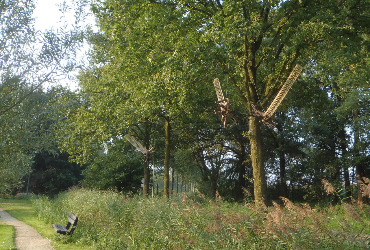Een installatie van 'zwevende bomen' in een park of in het bos. Het is surreëel: bomen die normaal zo goed geworteld zijn, de mensen een voorbeeld, die in de lucht lijken te zweven. Een experiment als voorzet voor uitvoering als land art project met meerdere 'bomen' schuin op de grond en hangend in de lucht. Voor land art Diessen 2014 maakte ik deze installatie in twee bomen langs het pad. Met als bijschrift: Wortelen en loslaten Een boom is voor ons een voorbeeld van geaard, geworteld zijn. Een boom staat stevig in de grond, groeit, reikt omhoog, maar verliest nooit het contact met de aarde. Behalve hier. Kan het samengaan, goed geworteld zijn en toch loslaten, loskomen? Of wordt het zweverig? En hoe is dat voor mensen, voor u?