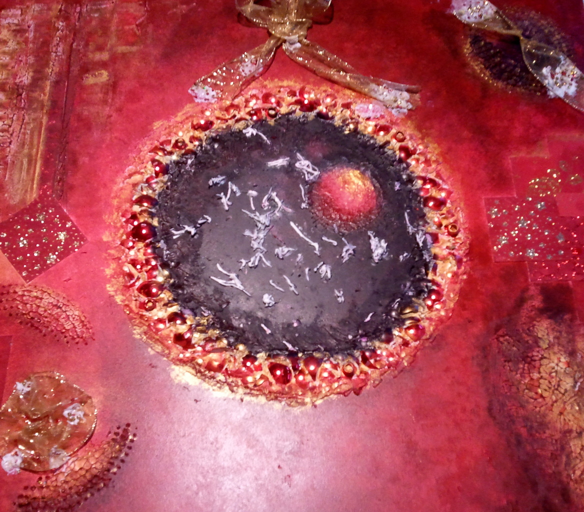 rode kerstballen stukgeslagen en in de pasta verwerkt , met goud lint