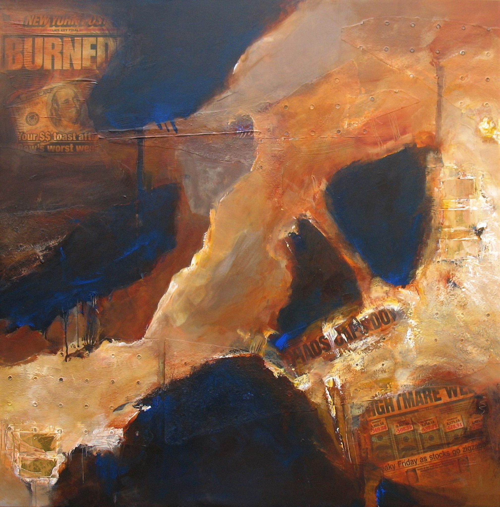 Burned! was een van de krantenkoppen van de New York Post in oktober 2008: het begin van de nieuwe Wall Street Crash. De ineenstorting van de dollar, de aandelenkoersen, de banken. De Great Depression van de 21e eeuw die nog steeds woedt. De donkere kleuren doen het ergste vermoeden. In oktober 2008 was ik in New York. De gebruikte krantenkop in het doek komt van de Washington Post uit die dagen.