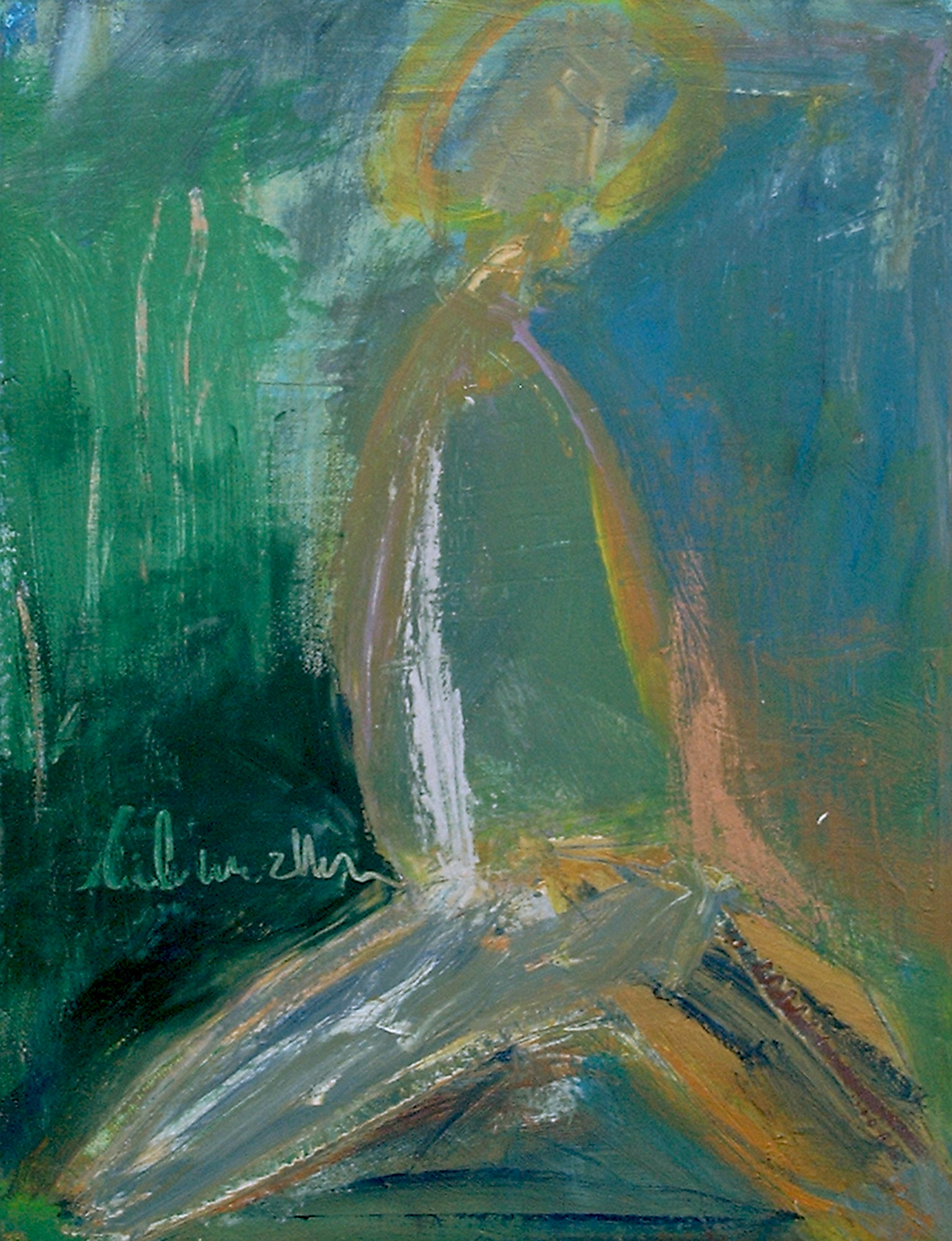 zittend figuur op doekgrootte in turquoise, groen/blauwtinten, koper, wat gebroken witten met ingekraste tekst