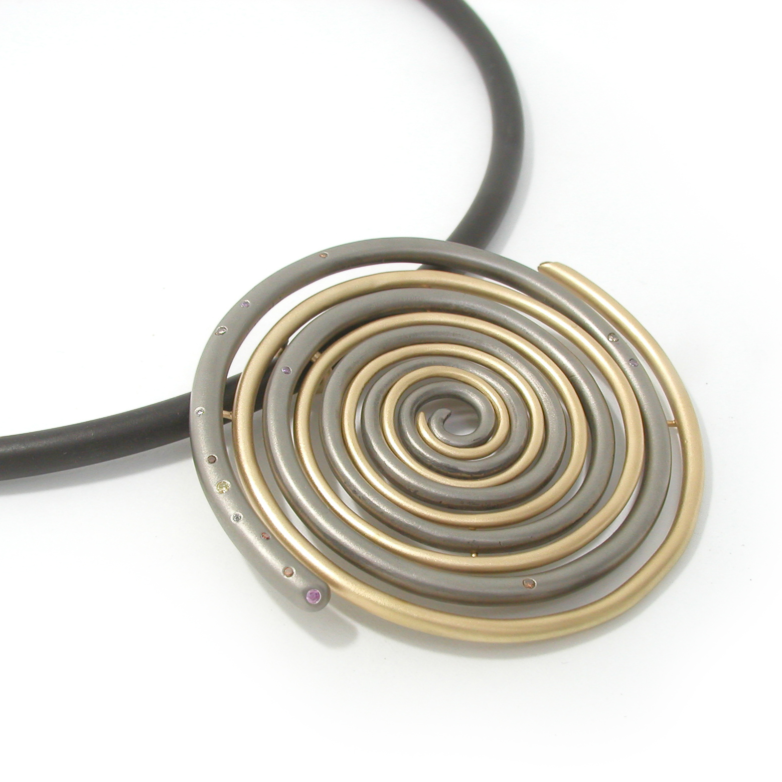 Broche en tevens hanger. 18 kt. geelgoud gecombineerd met titanium. Bezet met fancy-gekleurde diamantjes (wit, bruin en paars). Gecombineerd met zwart rubberen halssnoer met titanium bajonetsluiting.