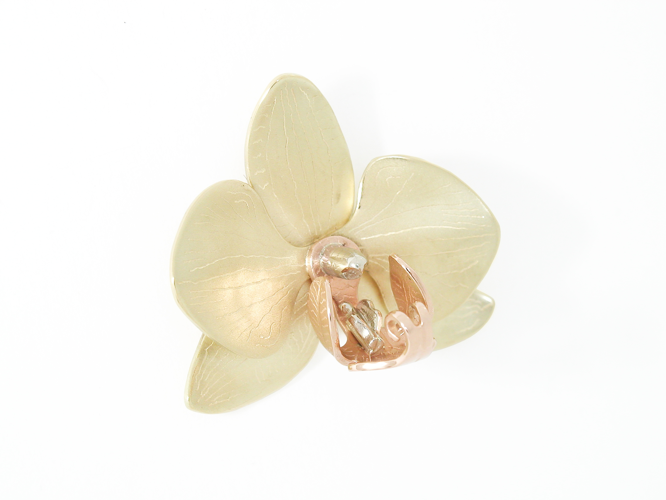 Orchidee gemaakt als hanger in opdracht van geel-, rood- en witgoud.