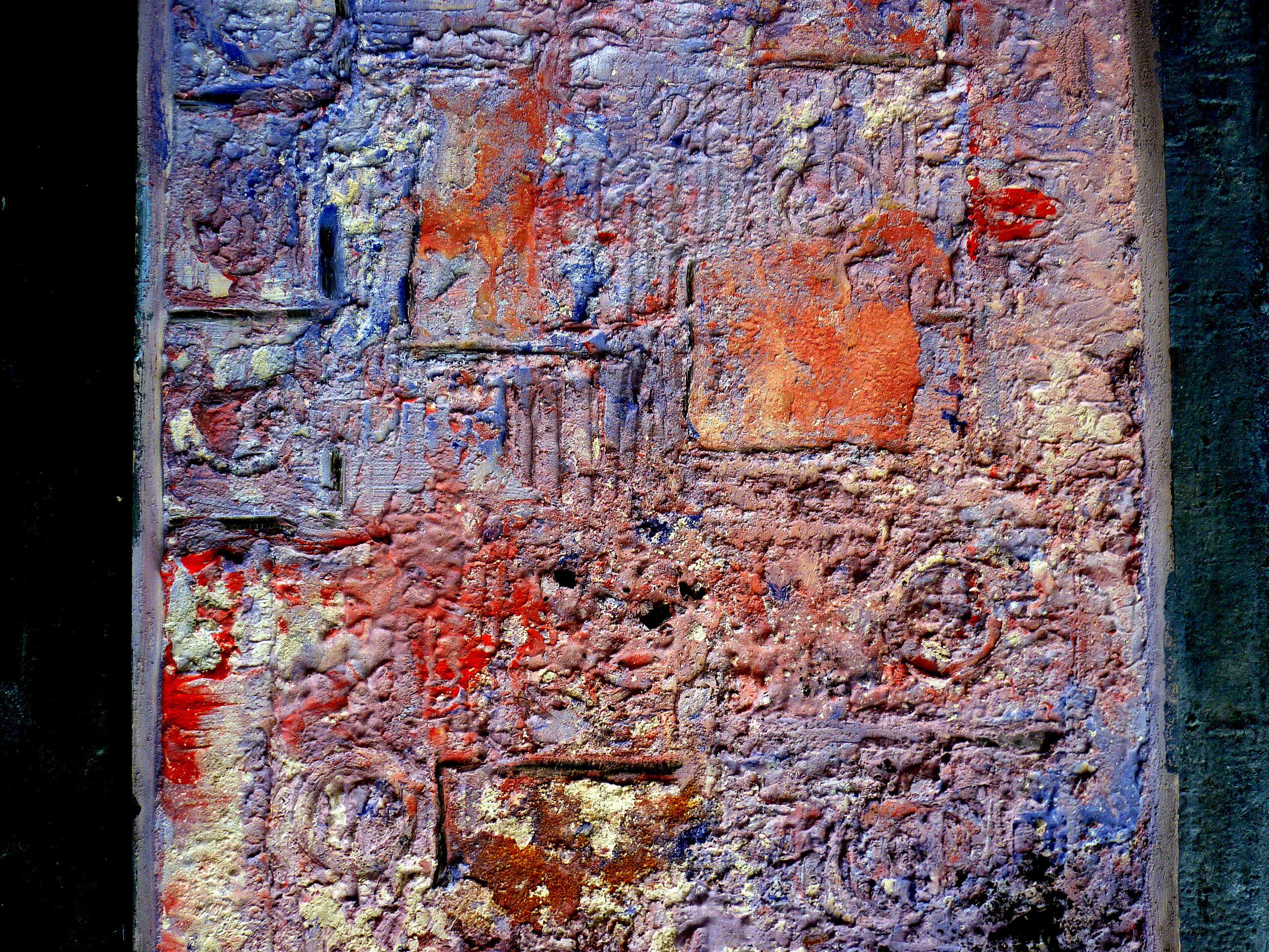 Houten paneel op canvasdoek opgebouwd uit gietsteen, zand, acryl