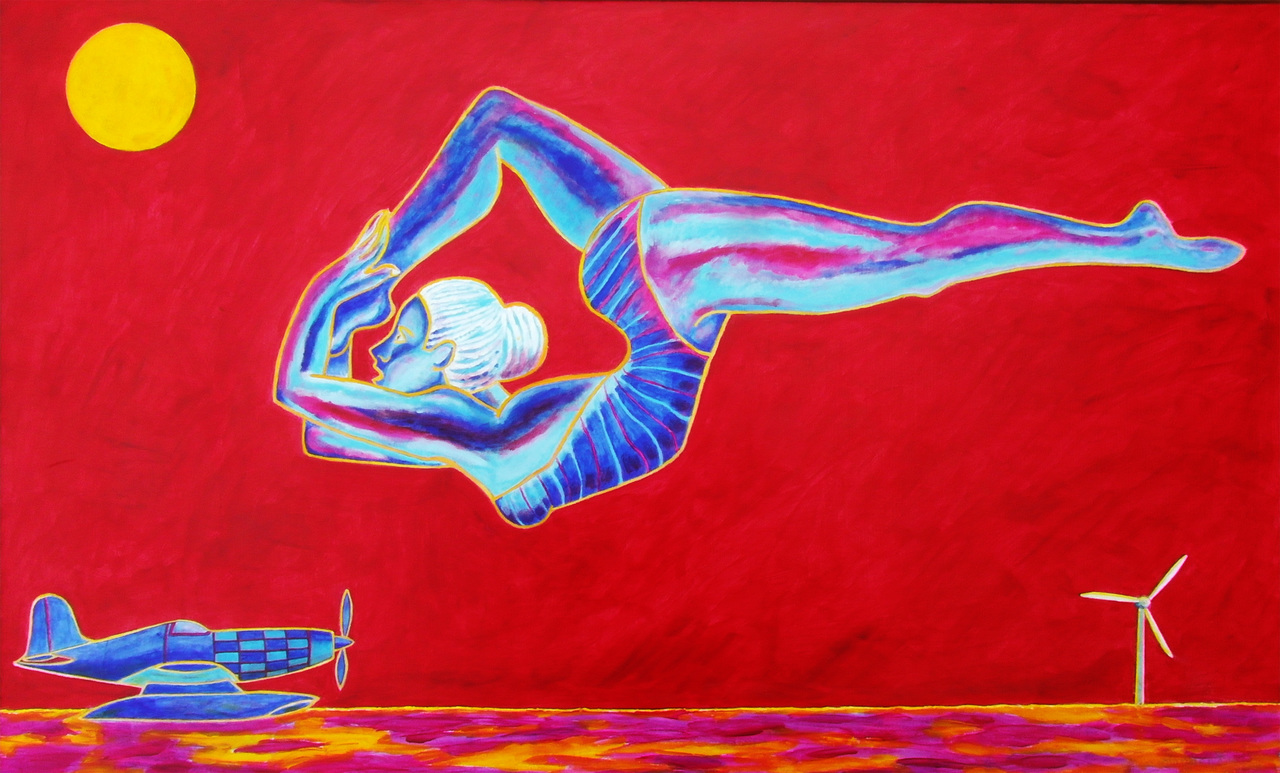 Zwevende danseres boven zee met vliegtuig en windmolen zie gedicht van Sjoerd Visser op pagina 21 van "TRITONLAAN WëSTERWOLDE": "valt ze omlaag/ in zee/die neemt haar mee/moet ze zwemmen/voor haar leven/haar bestaan"