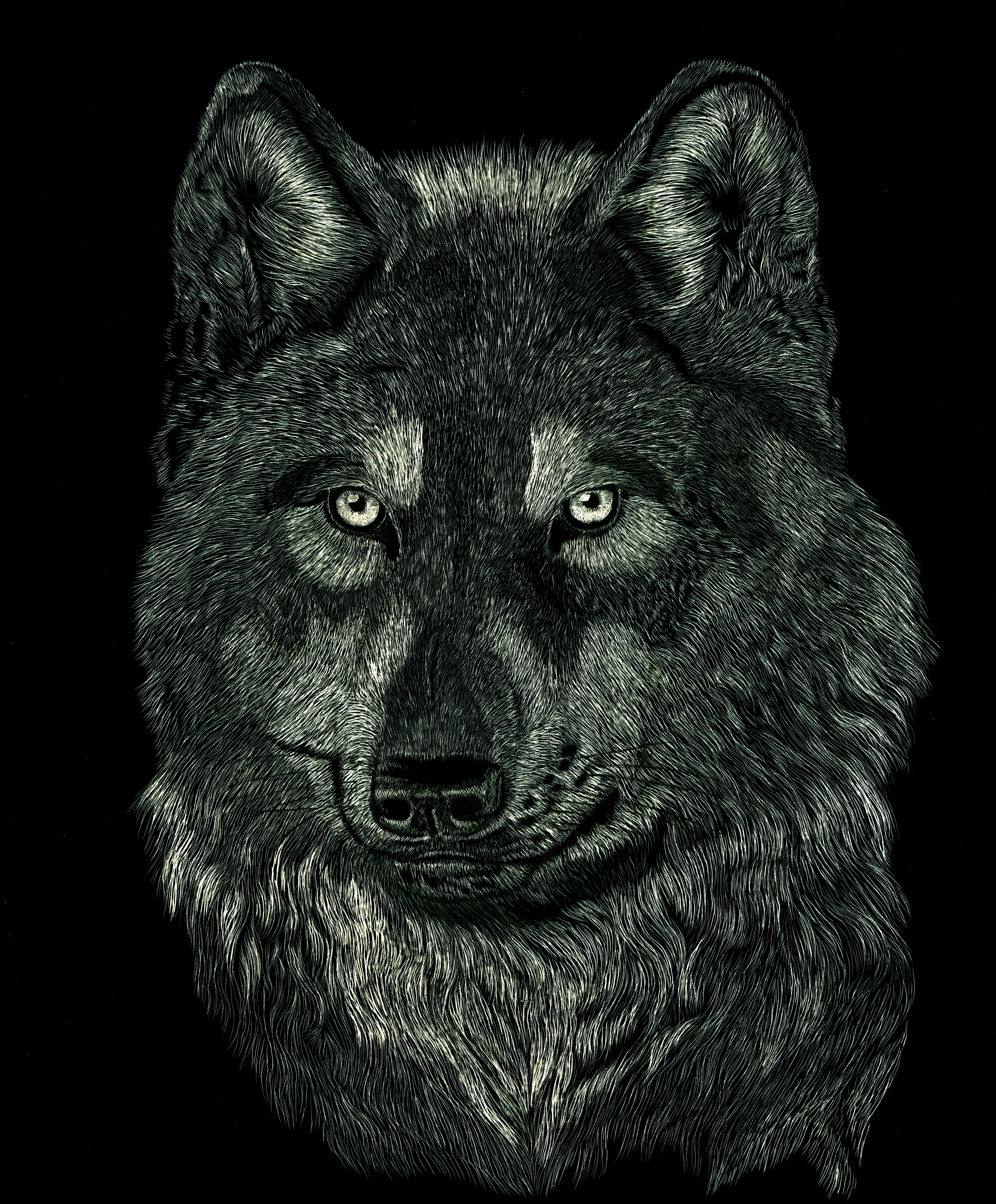 Wolf Canis lupus lupus Kopstudie Wolf Gravure in Oost-Indische inkt. Foto van de gravure op aanvraag beschikbaar via de tab contact. Gravure te koop