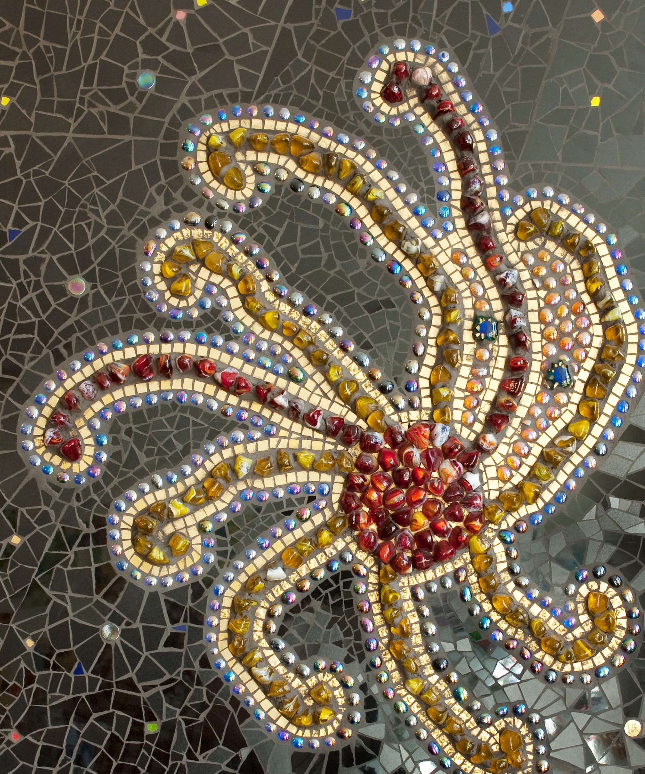 De Bad is ook gemaakt naar aanleiding van de film the Good, The Bad and the Ugly. Maar ook naar aanleiding van een televisie serie Octopussy. De meest aangrijpende serie die ik ooit heb gezien. Mozaiek met handgesneden keramiek, glasstenen, goud.