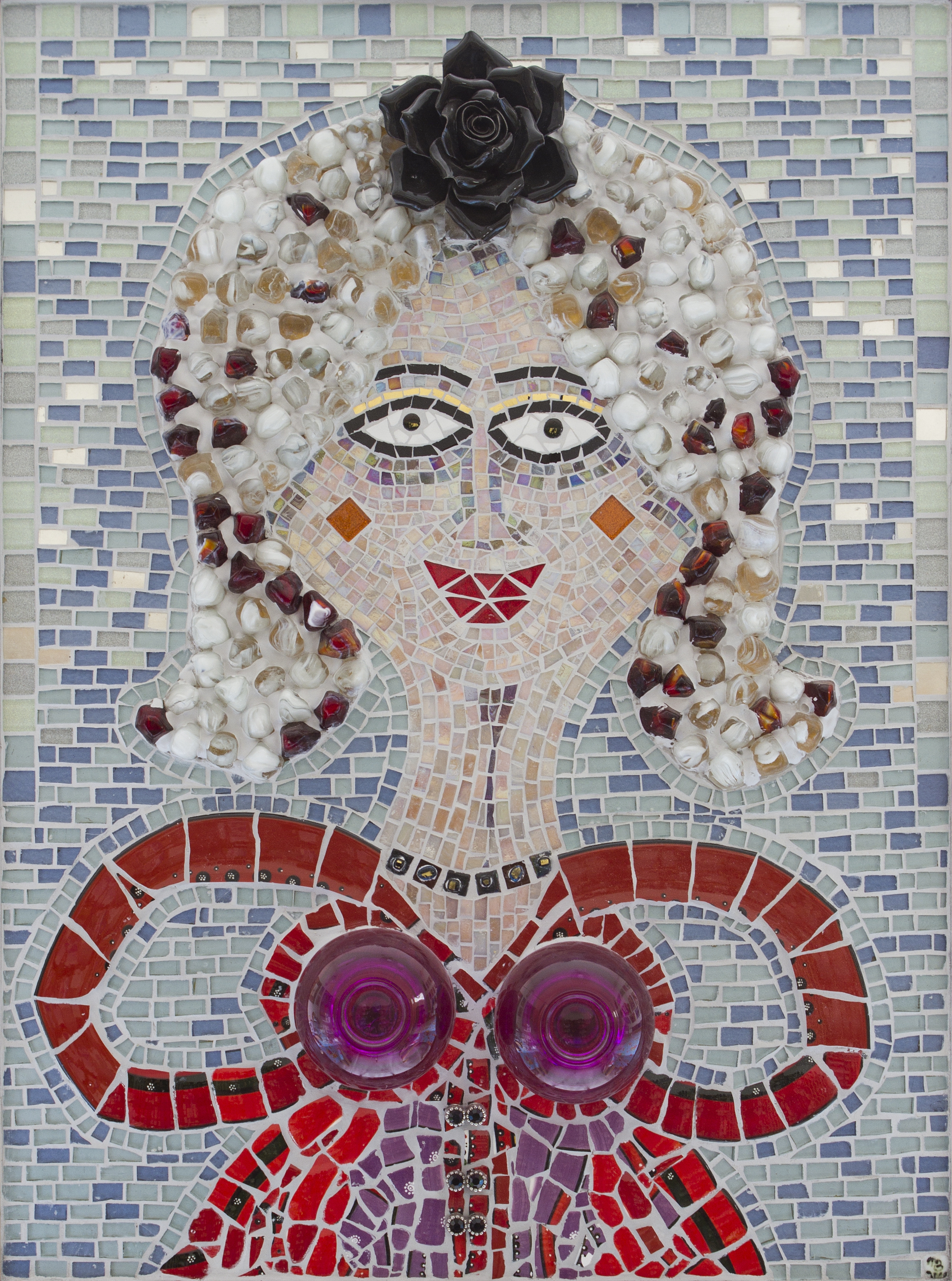 Wit Rood Zwart Vrouw Bloem Lichtblauw 2 Borsten Blij Keramiek Dimensionaal Mozaiek Glasobjecten