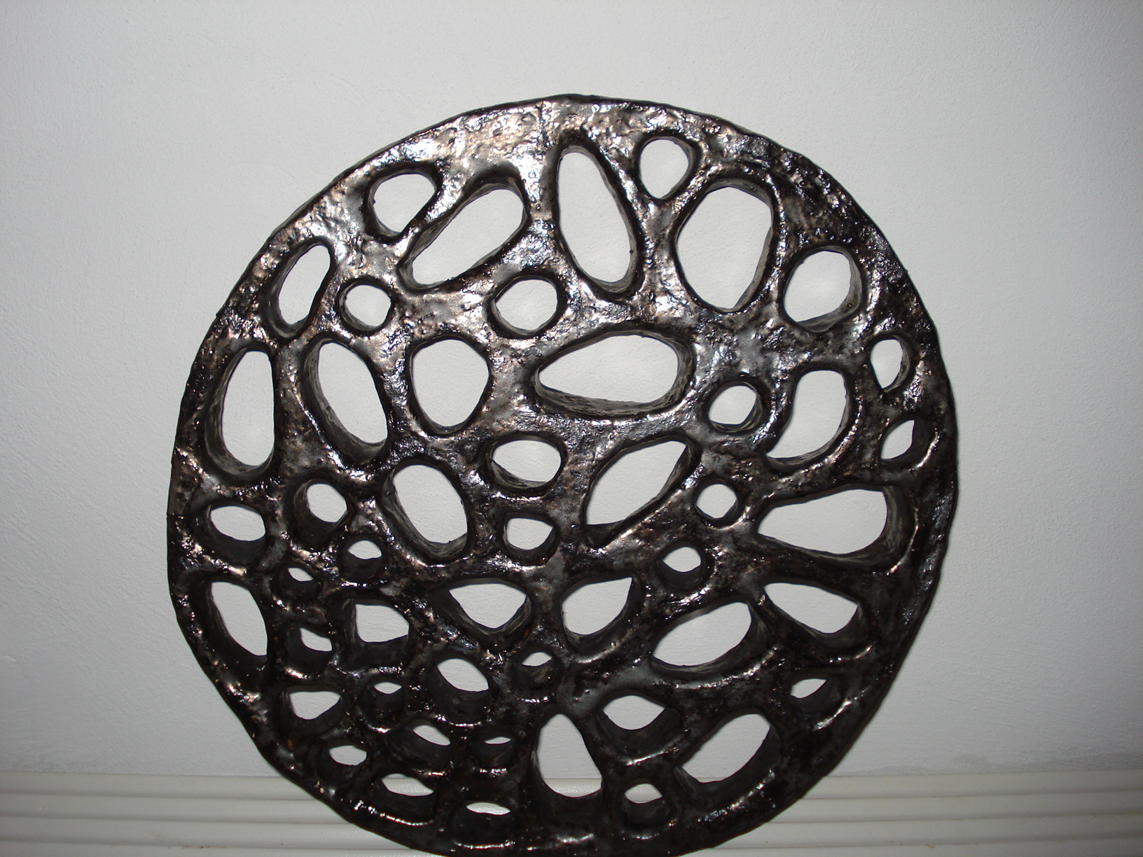 Doolhohofwiel handgevormd uit witte klei en geglazuurd met mangaanglazuur. Gestookt op 1060 graden.