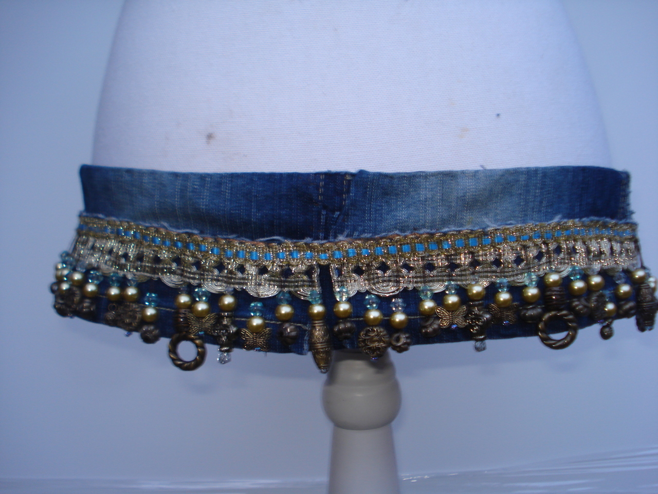 Ceintuur gemaakt van spijkerstof met splitje achter. Versierd met goud kant en verschillende kralen bungelend aan koordjes.