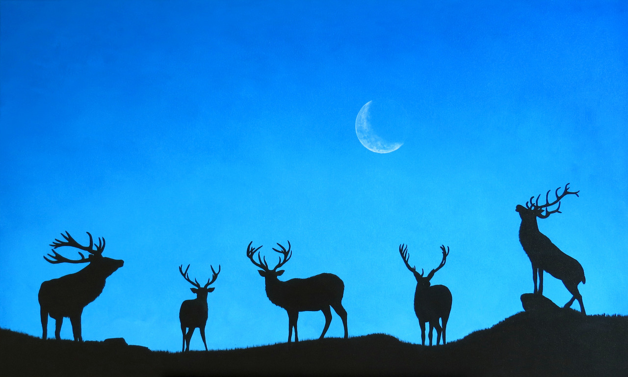 Schilderij Blauw Acryl Wildlife Maan Dier Hert Wild Silhouet Ree Dierenkunst Deer Elk Bronst