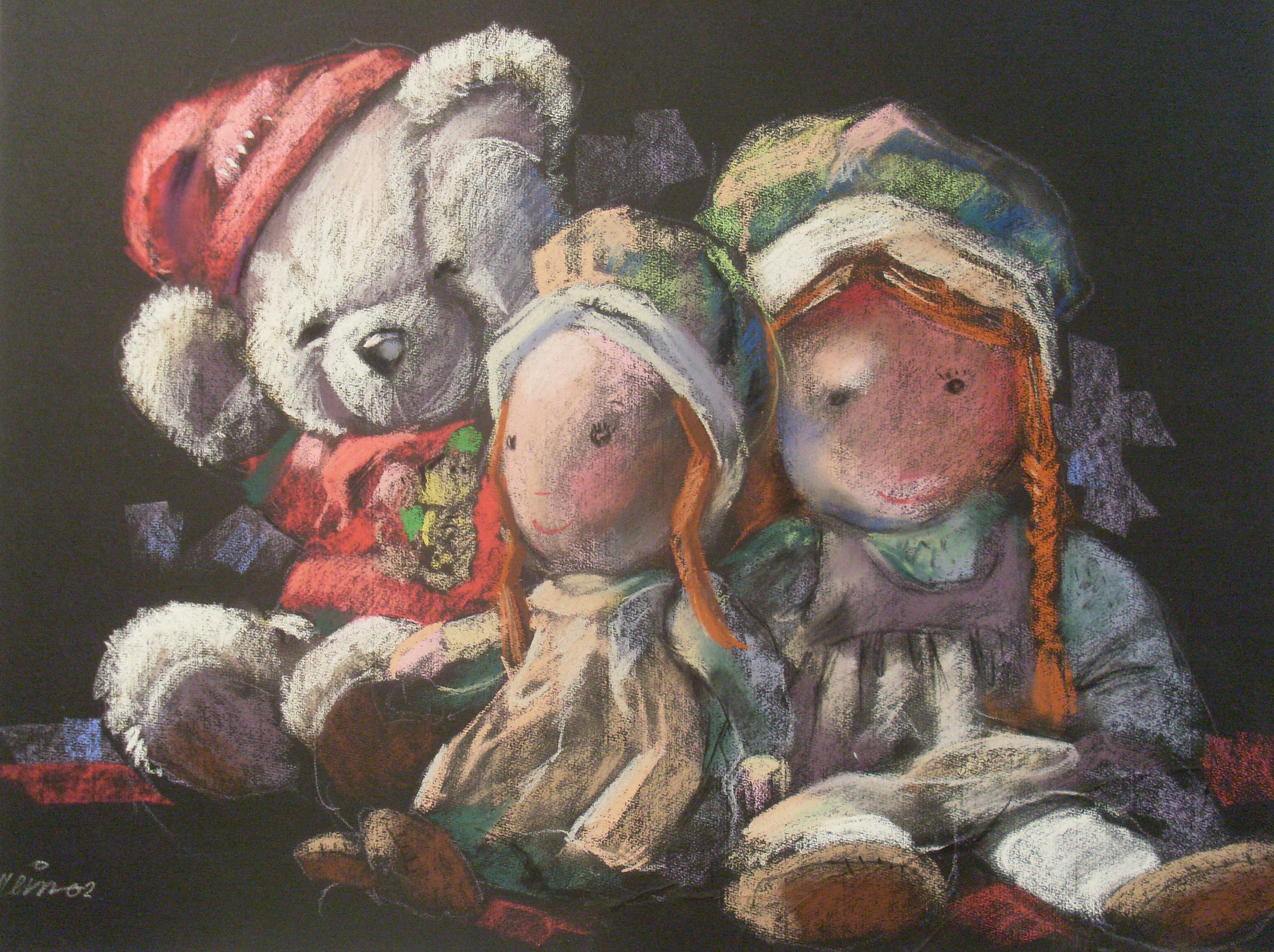 Poppen in ochtendlicht op donkere achtergrond. materiaal soft pastel.