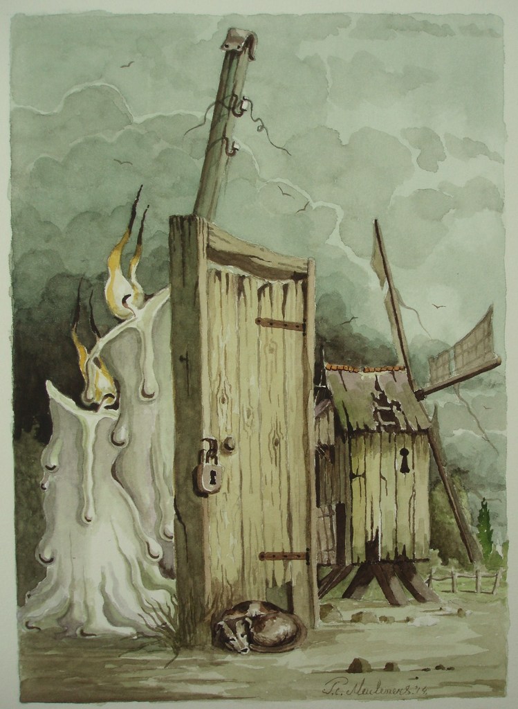 Windmolen Kaars Hond Landschap Aquarel Papier Realisme Fantasie Romantiek