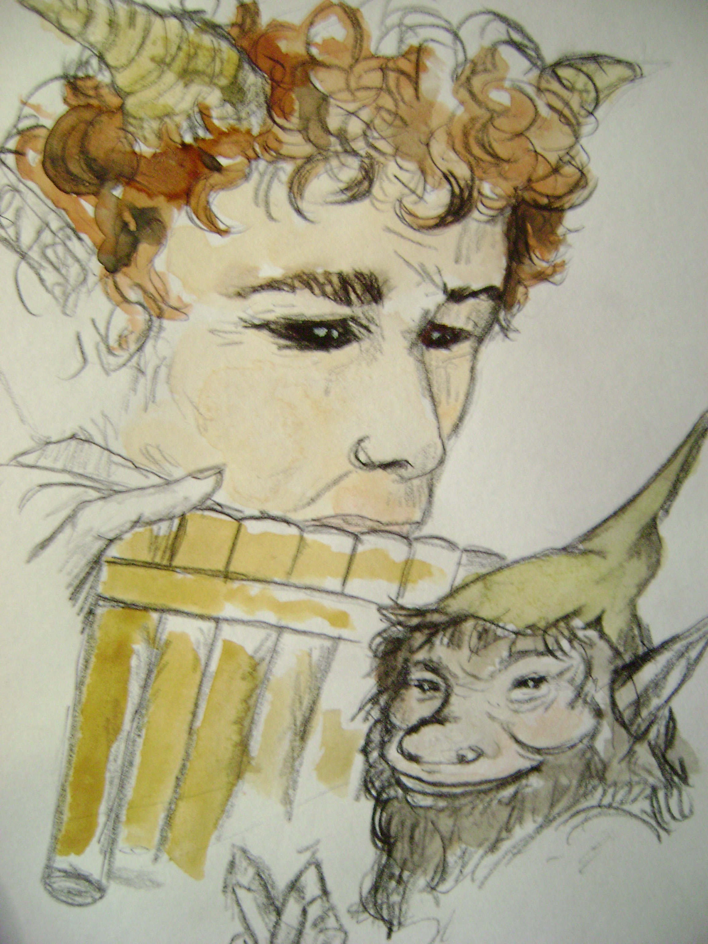 Pan en een Gnoom illustratie: Pan is de oude god van het buiten leven. Hij heeft de benen van een bok en een menselijk bovenlichaam. Een gnoom verzorgt de wereld van mineralen en kristallen. Het zijn ijverige mannetjes die leven in de krochten van de aarde.