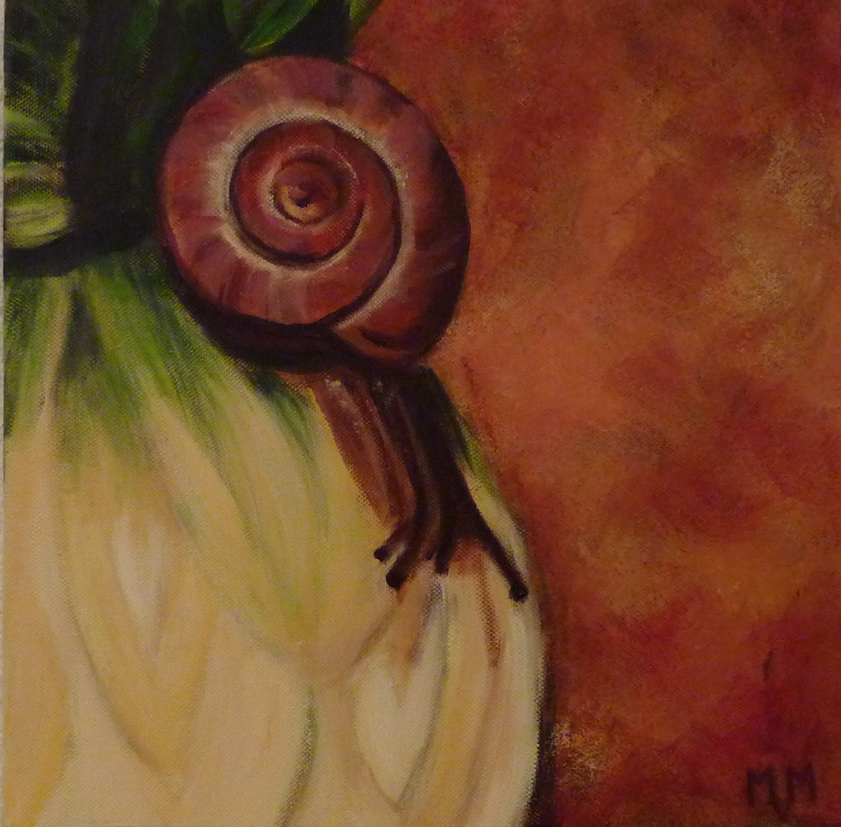 Een warm schilderijtje van een slakje op een plant of stuk groente. Ik heb hem samen opgehangen met 'Herfstpaddestoelen' en 'Grote rode paddestoel'.