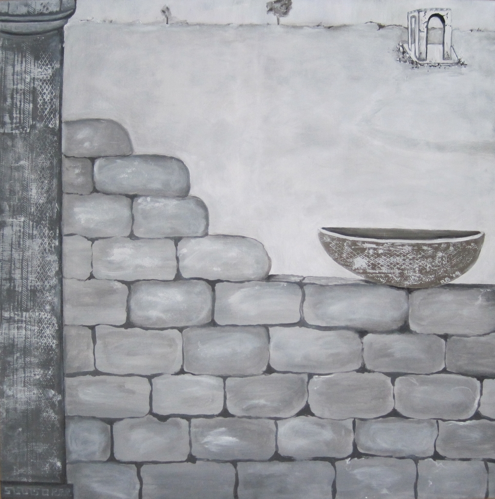 Muur met Griekse zuil, in zwart, wit, grijs en zilver