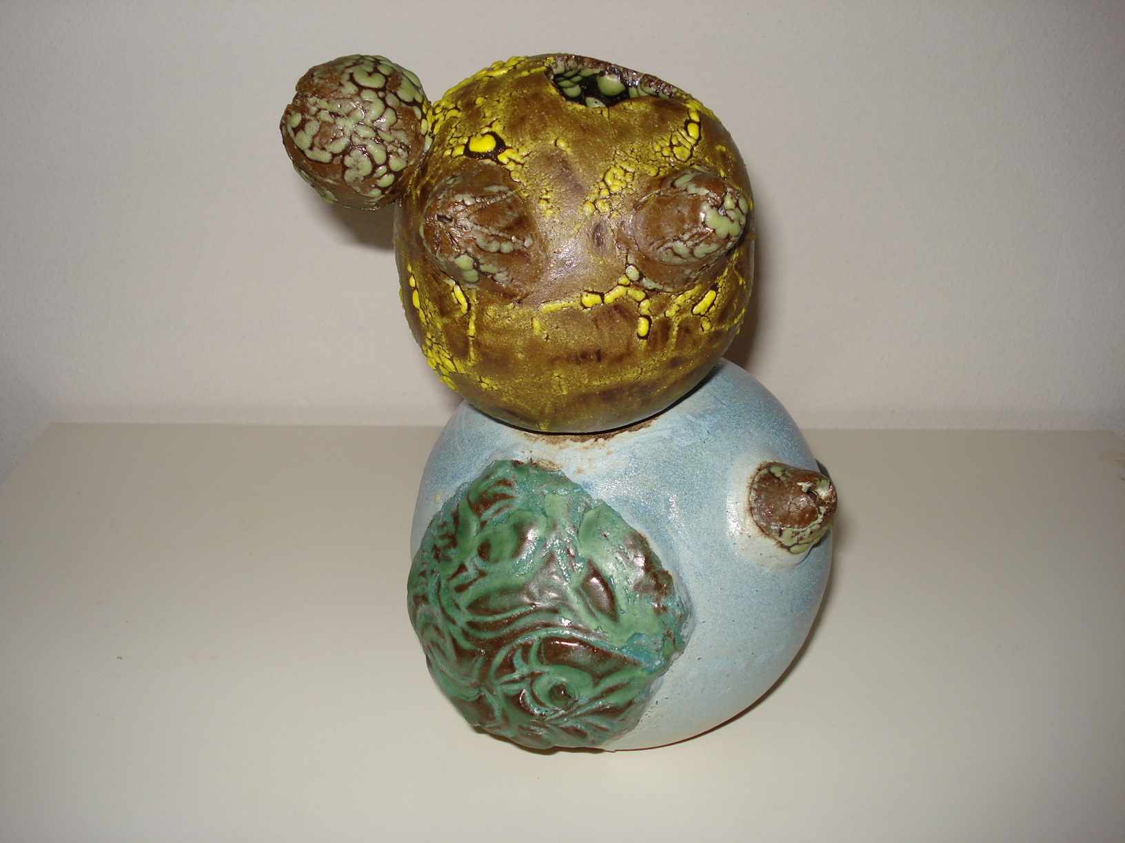 Fantasie zaadbol, zwarte aardewerk, geglazuurd met verschillende glazuren en gestookt op 1060 graden