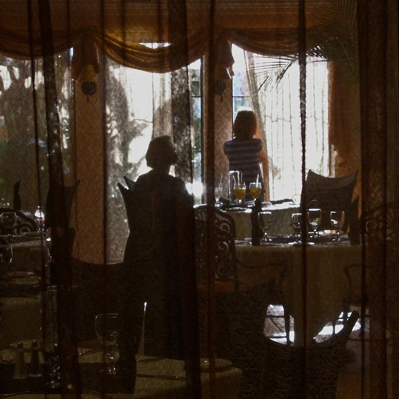 Ontbijtzaal in hotel in Saint Augustines, Florida, USA in mei 2009. Camera vergeten, teruggelopen naar de hotelkamer en vlak voor het betreden van de ontbijtzaal waar mijn vrouw en dochter (mijn zoon was er ook maar niet in beeld hier) zaten te wachten zag ik dit tafereel. Ondanks het dikke glas en de meerdere lagen gordijnen in een mijn ogen sfeervolle en geslaagde opname. Deze inzending voor de wedstrijd van de regionale fotobond afdeling Twente kreeg een bronzen sticker.