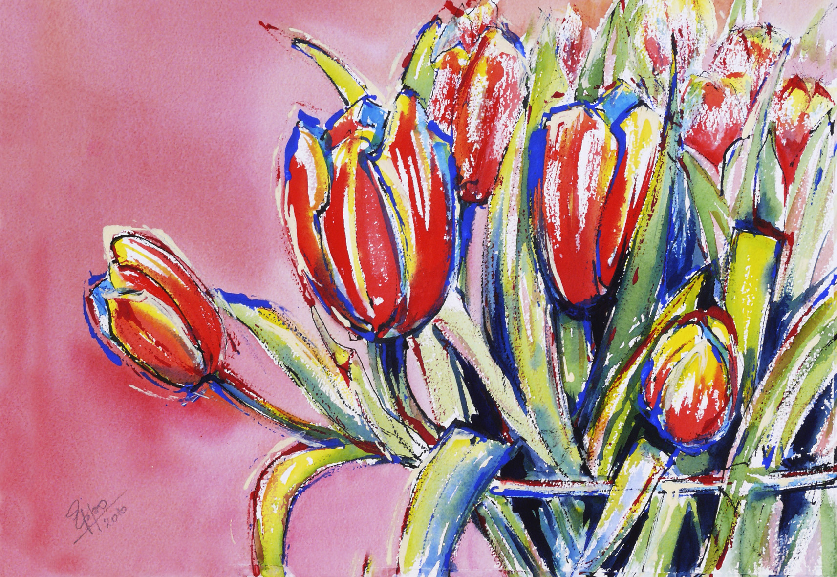 Rood Geel Acryl Rode Tulp Tulpen Groen Bloemen Glas Vaas Aquarel Realistisch Bladeren Bloem Winter Blad Voorjaar Glazen Bosch Gele Stengel Eppo Voorjaars