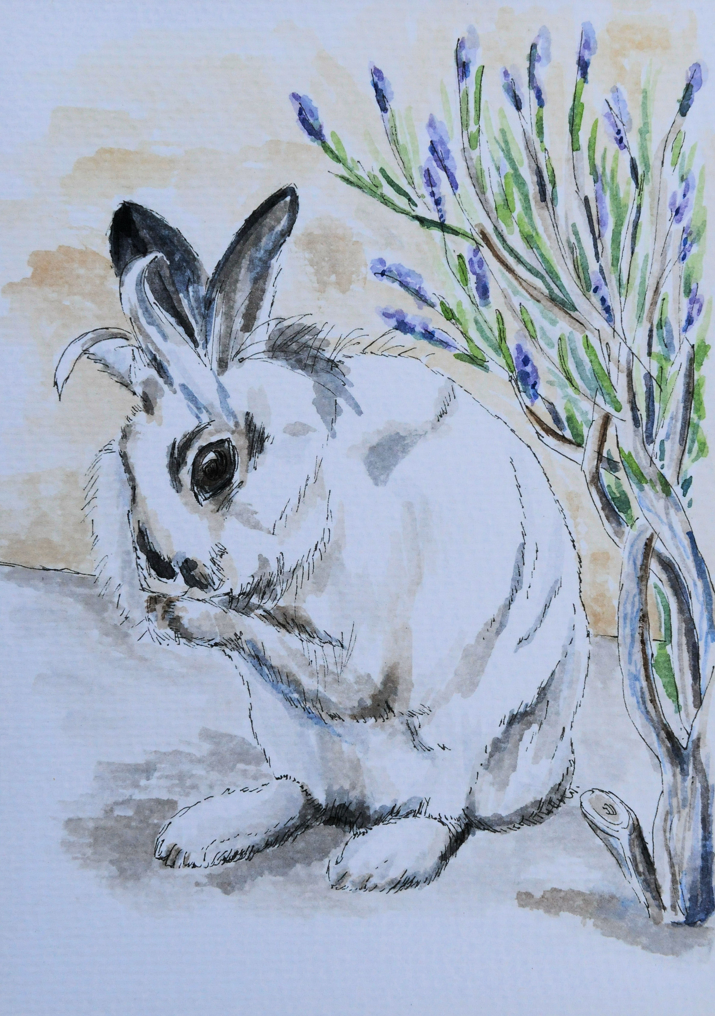 Aquarel van konijn. Inclusief paarse lijst (niet afgebeeld).